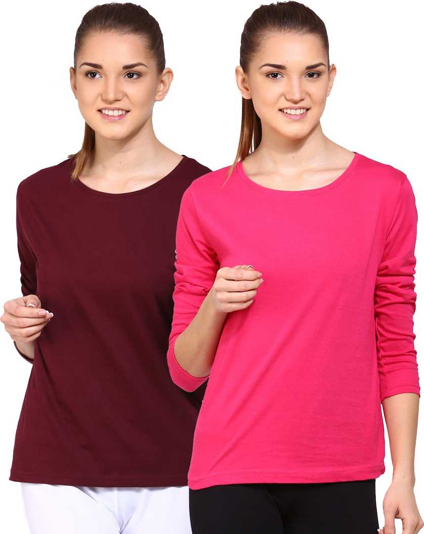 Solid Women's Round Neck Brown, Pink T-Shirt (Pack of 2)