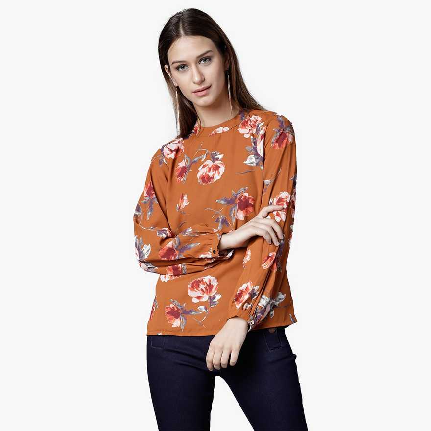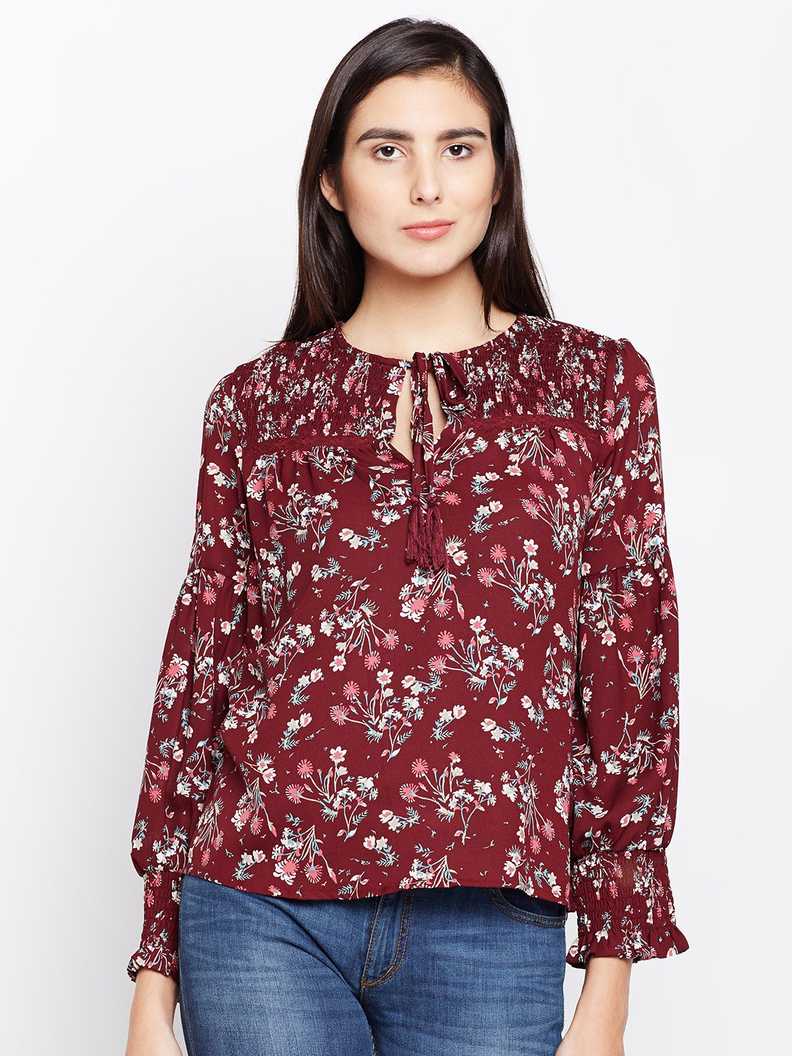 Casual Bishop Sleeve Floral Print Women Maroon Top