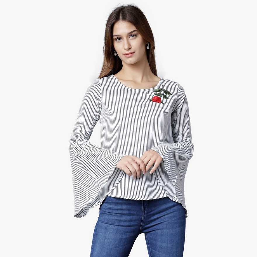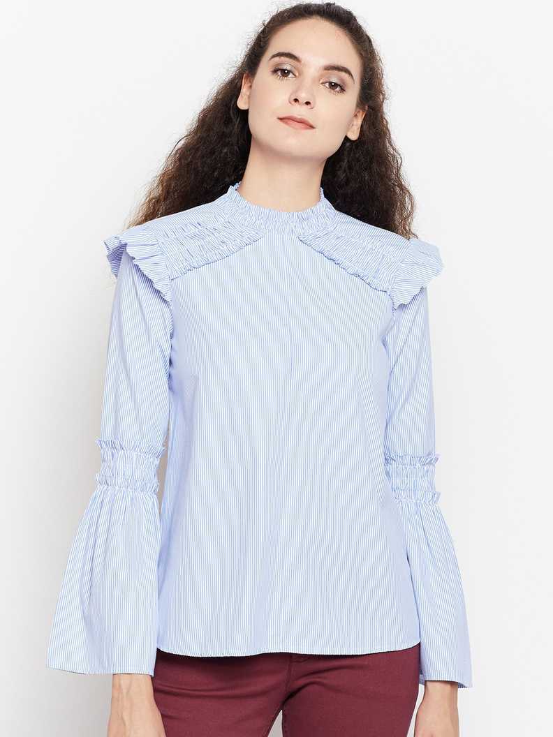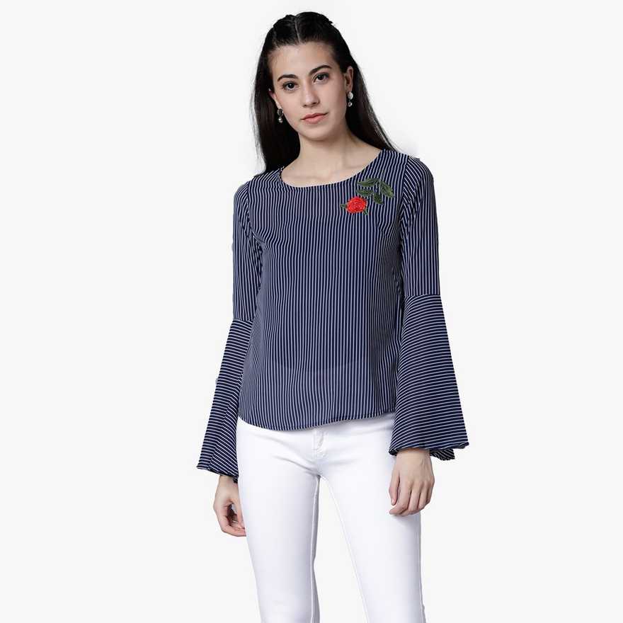 Casual Bell Sleeve Striped Women Blue Top