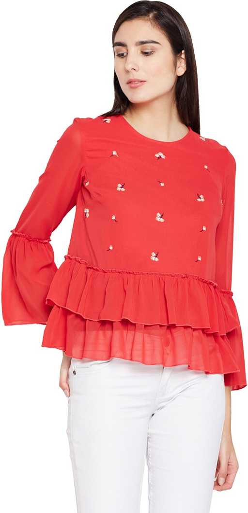Casual Bell Sleeve Embroidered Women Red Top