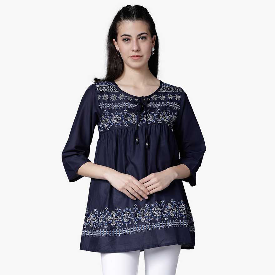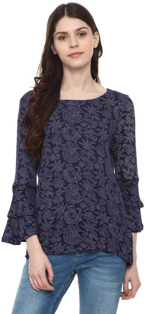 Casual 3/4 Sleeve Printed Women Dark Blue Top