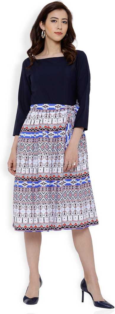 Women Fit and Flare Dark Blue, White Dress