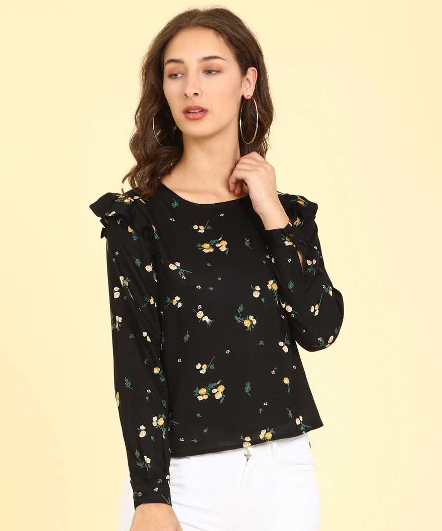 Casual Full Sleeve Printed Women Black Top
