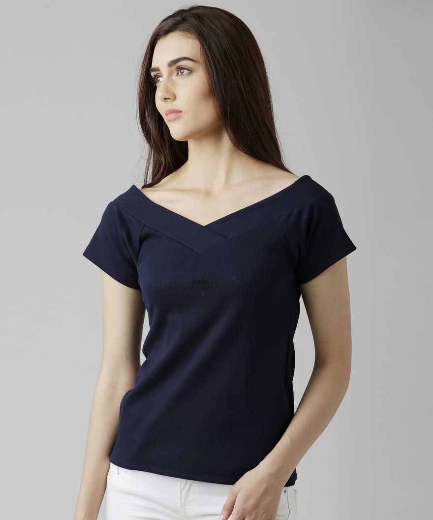 Party Short Sleeve Solid Women Dark Blue Top