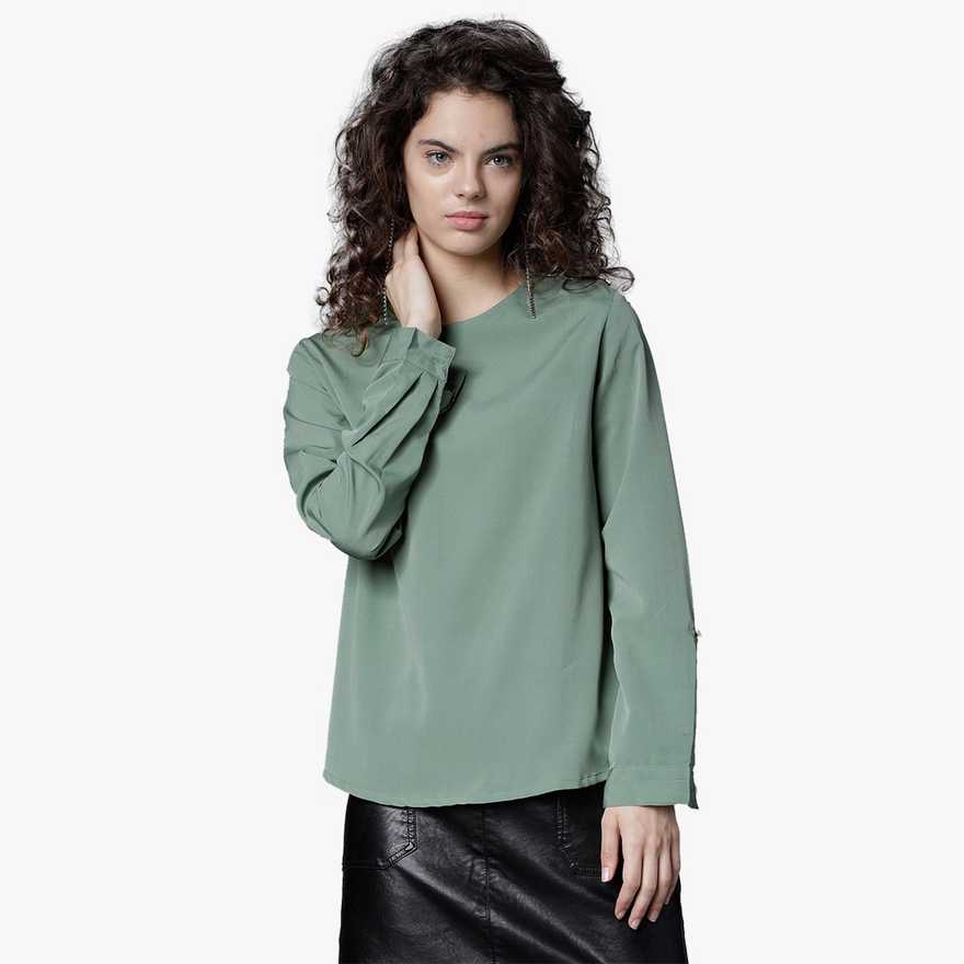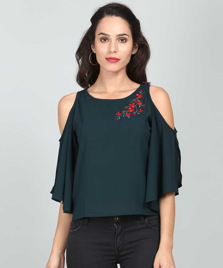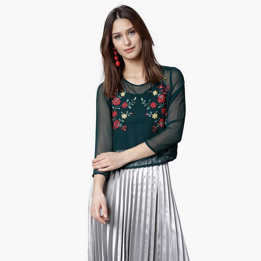 Casual Full Sleeve Embroidered Women Dark Green Top