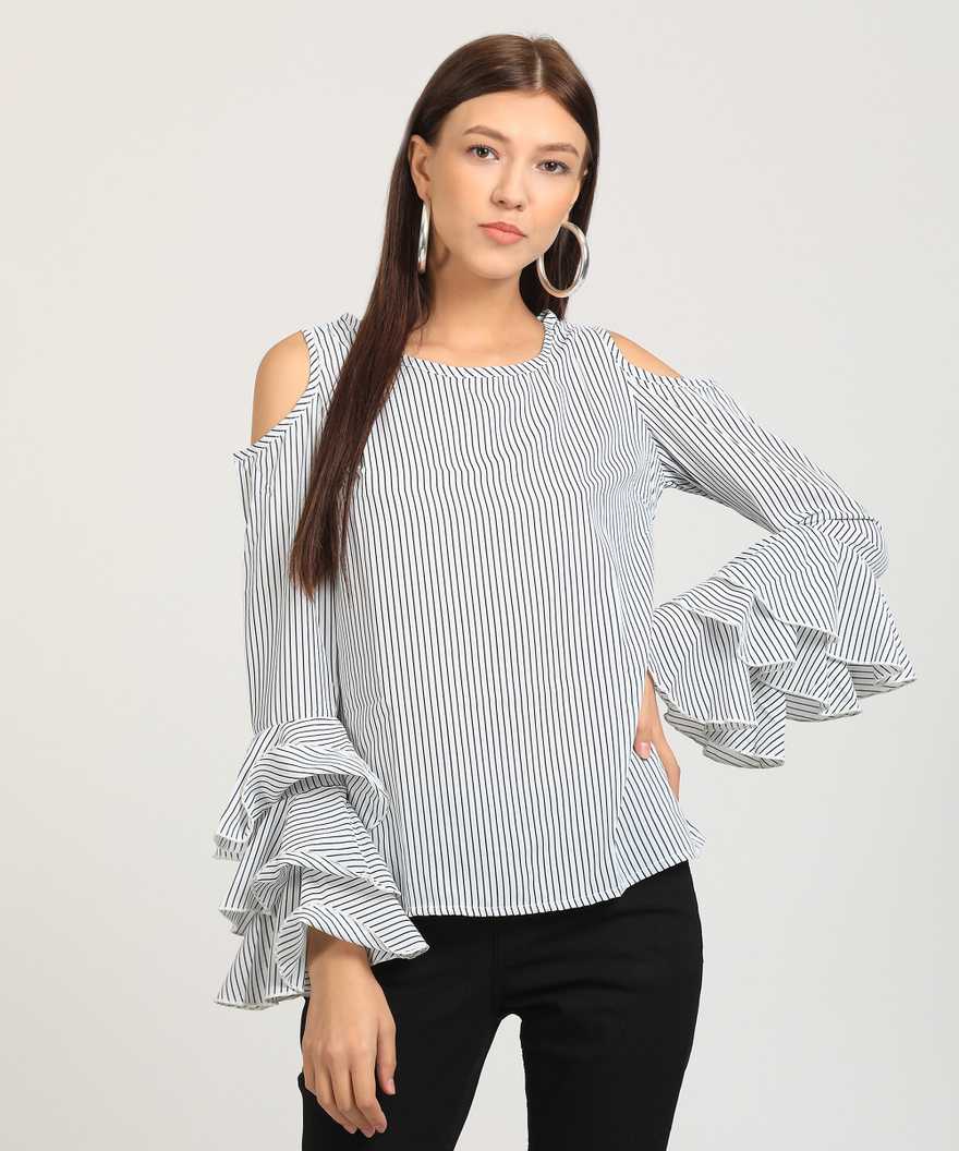 Casual Layered Sleeve Striped Women's White, Blue Top