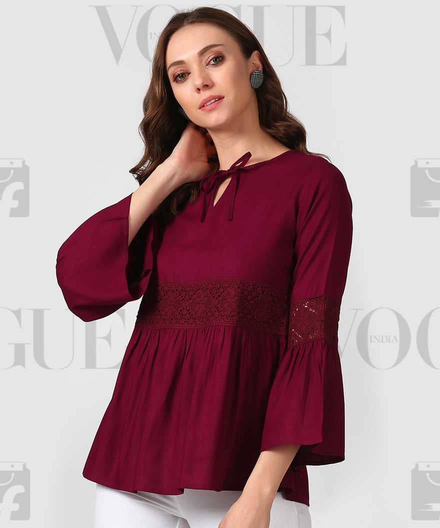 Party Flared Sleeve Solid Women's Maroon Top