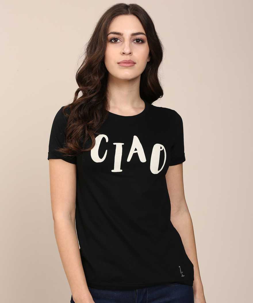 Printed Women Round Neck Black T-Shirt