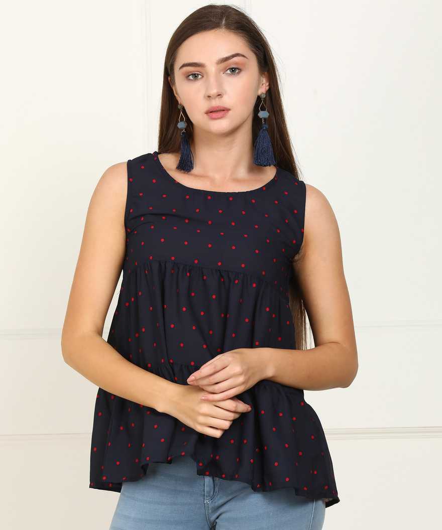 Casual Sleeveless Polka Print Women Dark Blue Top