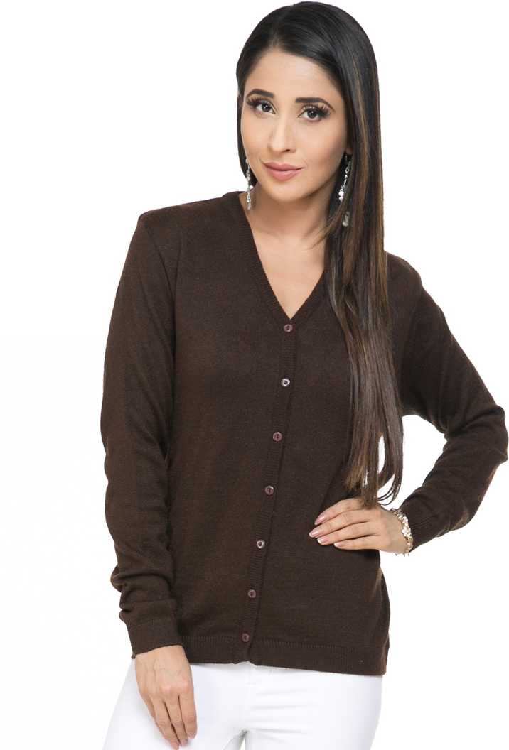 Solid V-neck Casual Women Brown Sweater