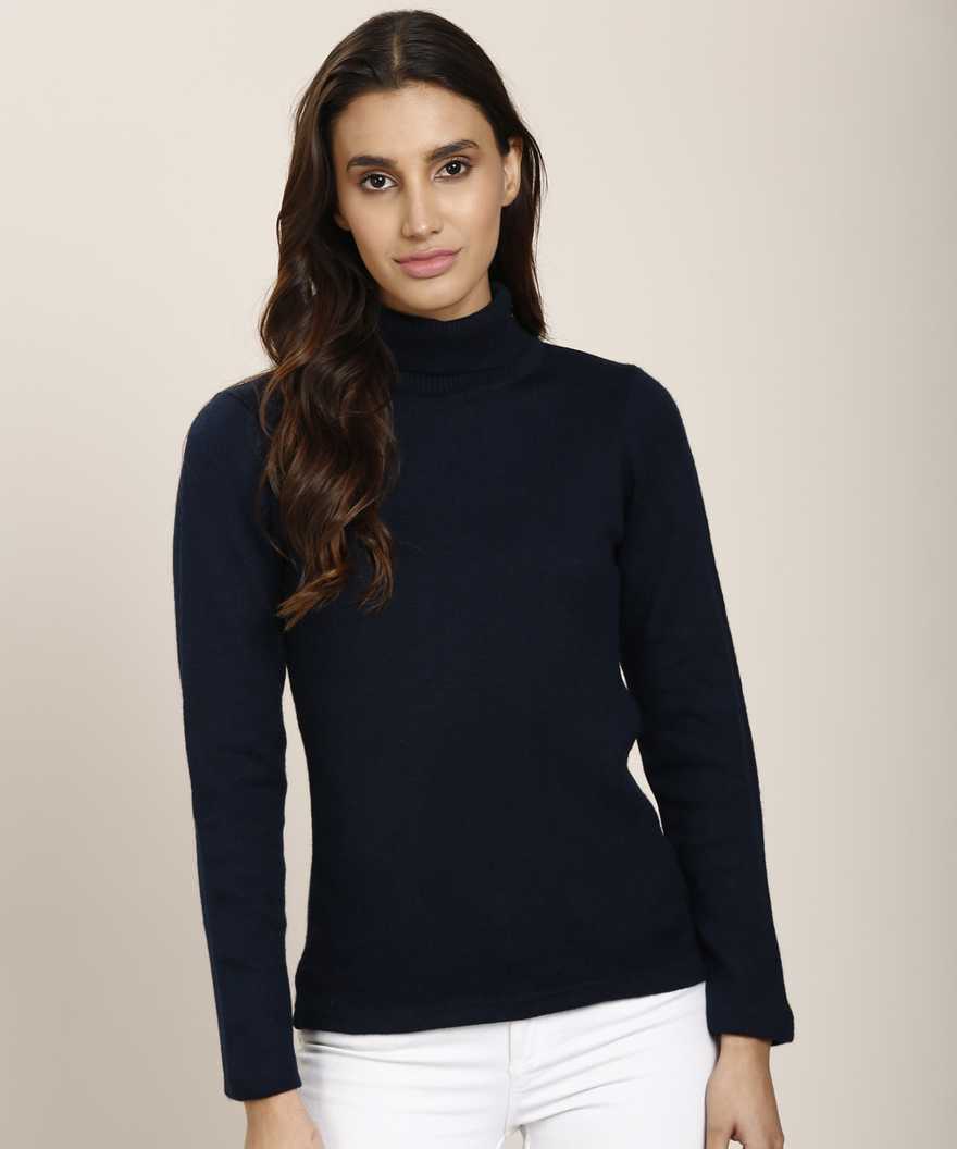 Solid Turtle Neck Casual Women's Dark Blue Sweater