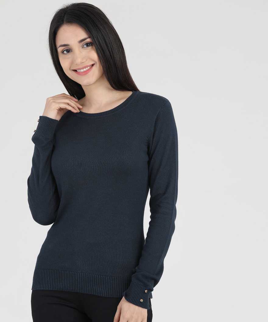 Solid Round Neck Casual Women's Dark Blue Sweater