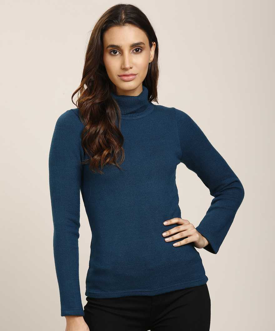 Solid Turtle Neck Casual Women's Blue Sweater