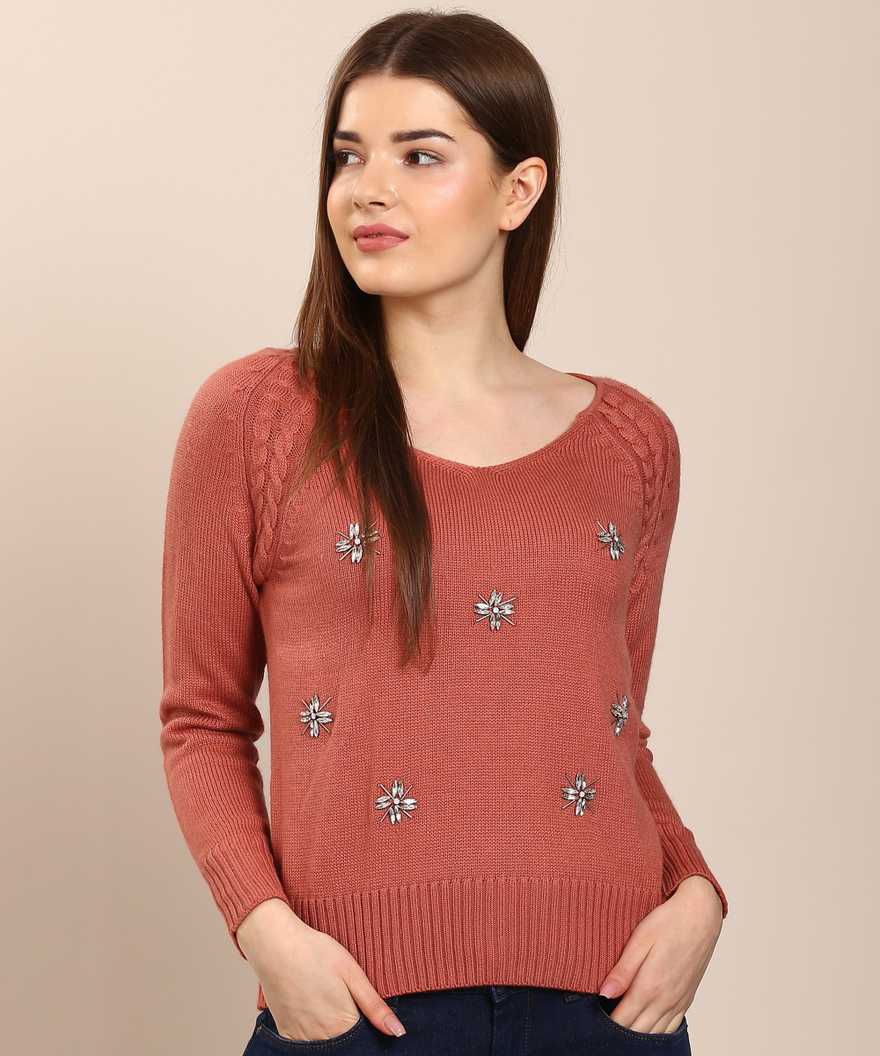 Embellished V-neck Casual Women's Orange Sweater