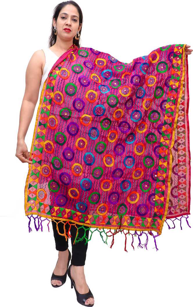 Characteristic imperfections associated with hand embroidery may be observed, and colours may fade or bleed due to the traditional dyeing and printing process employed |