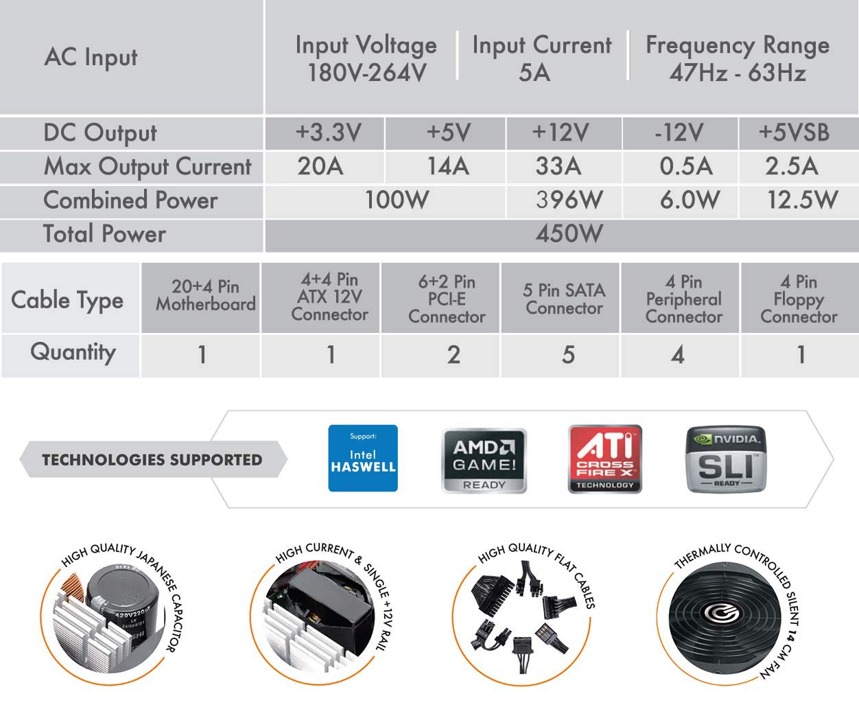 SPECIFICATIONS: ? MODEL- 450 WATT APFC 80 Plus Bronze ? 80 PLUS- Bronze ? POWER - 450 Watts ? FAN BEARING TECHNOLOGY - Hydraulic Long-life sleeve ? FAN SIZE - 140 mm ? FLAT CABLES - Yes ? ATX CONNECTOR - 1 (4+4 Pin) ? PCI-E CONNECTOR - 2 (6+2 Pin) ? MOTHERBOARD CONNECTOR - 1 (20+4 Pin) ? SATA CONNECTOR - 5 (5 Pin) ? PERIPHERAL CONNECTOR - 4 (4 Pin) ? FLOPPY CONNECTOR - 1 (4 Pin) |