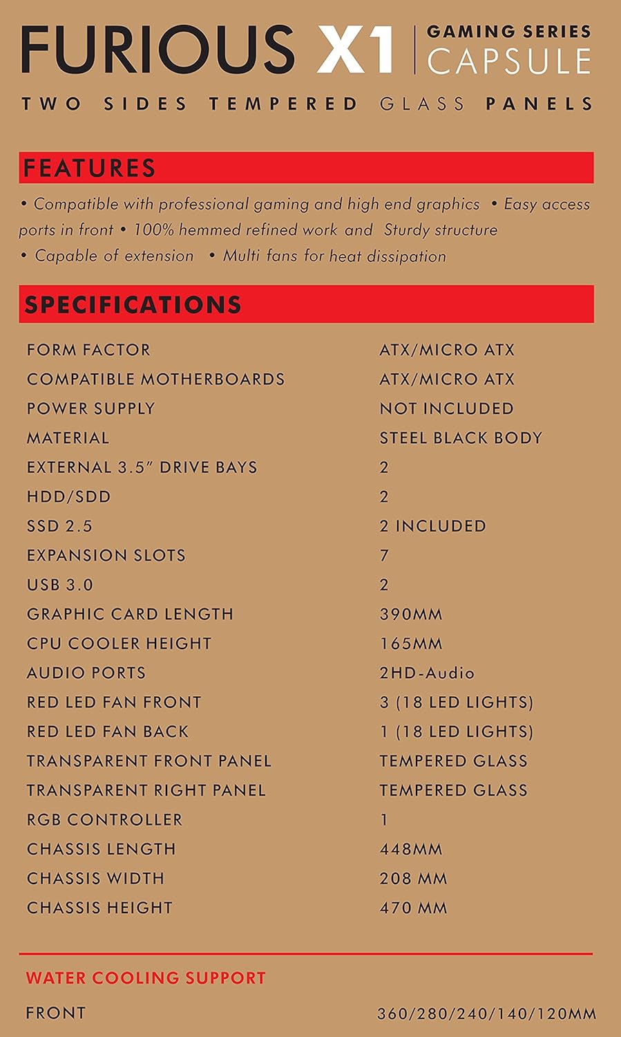 FEATURES ? Compatible with professional gaming and high end graphics. ? Easy access ports in front. ? 100% hemmed refined work & sturdy structure. ? Capable of extension. ? Multi fans for heat dissipation ? SPECIFICATIONS: ? FORM FACTOR: ATX/MICRO ATX ? COMPATIBLE MOTHERBOARDS: ATX/MICRO ATX ? POWER SUPPLY: NOT INCLUDED ? MATERIAL: STEEL BLACK BODY ? EXTERNAL 3.5" DRIVE BAYS: 2 ? HDD/SDD: 2 ? SSD 2.5: 2 INCLUDED ? EXPANSION SLOTS: 7 ? USB 3.0: 2 ? GRAPHIC CARD LENGTH: 390MM ? CPU COOLER HEIGHT: 165MM ? AUDIO PORTS: 2 HD-AUDIO ? RED LED FAN FRONT: 3 (18 LED LIGHTS) ? RED LED FAN BACK: 1 (18 LED LIGHTS) ? TRANSPARENT FRONT PANEL: TEMPERED GLASS ? TRANSPARENT RIGHT PANEL: TEMPERED GLASS ? RGB CONTROLLER: 1 ? CHASSIS LENGTH: 448 MM ? CHASSIS WIDTH: 208 MM ? CHASSIS HEIGHT: 470 MM ? WATER COOLING SUPPORT (FRONT): 360/280/240/140/120MM |