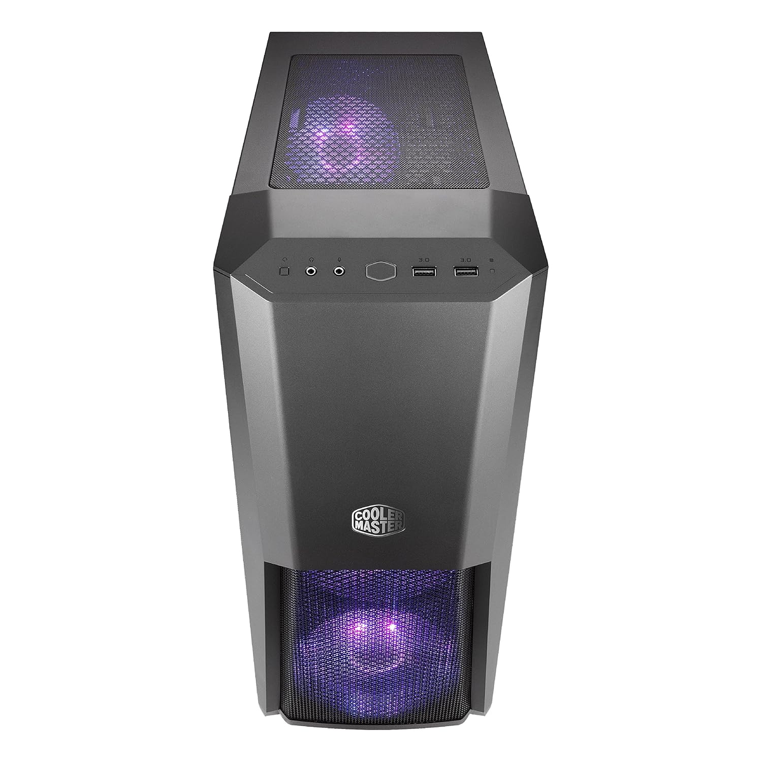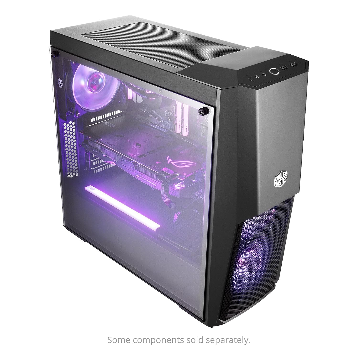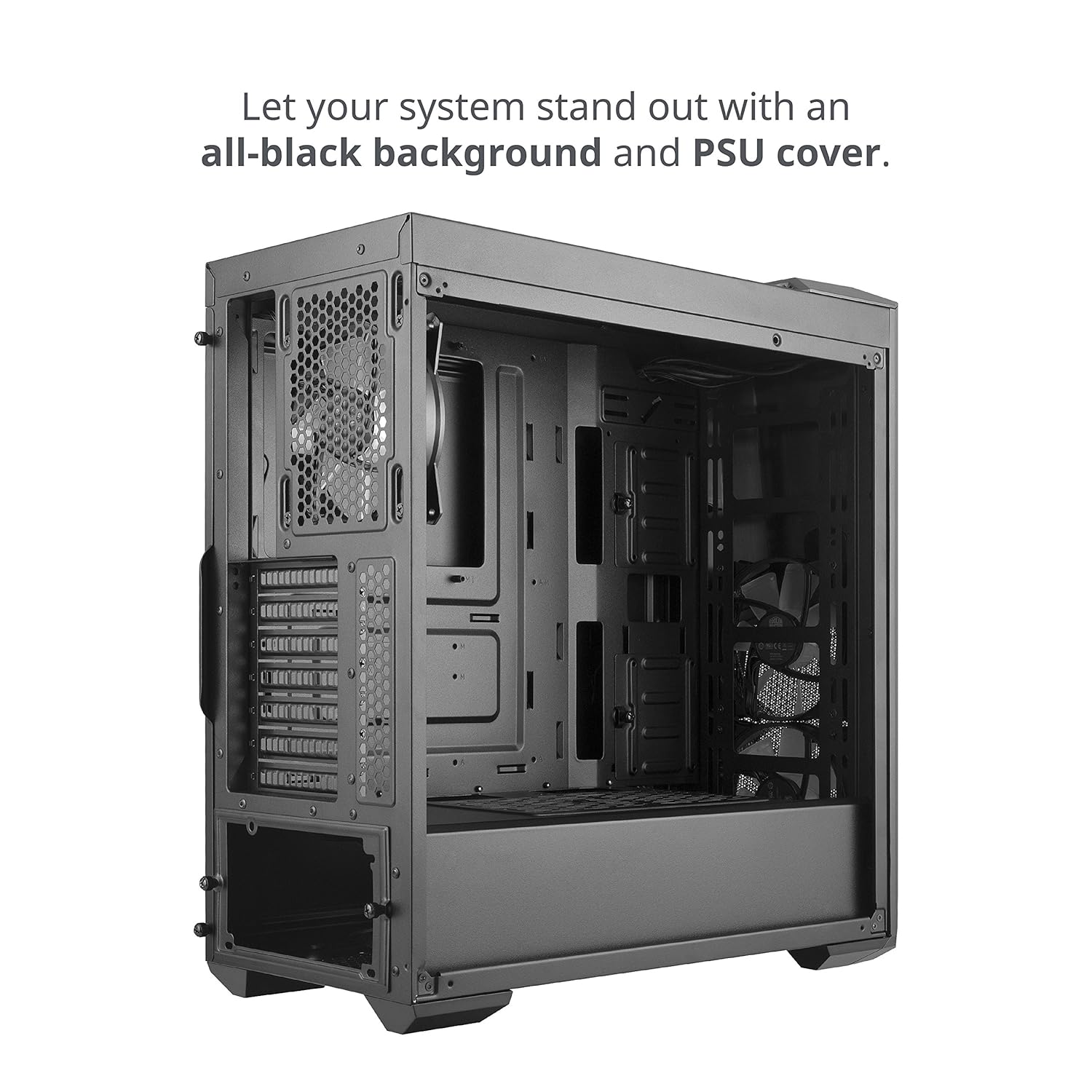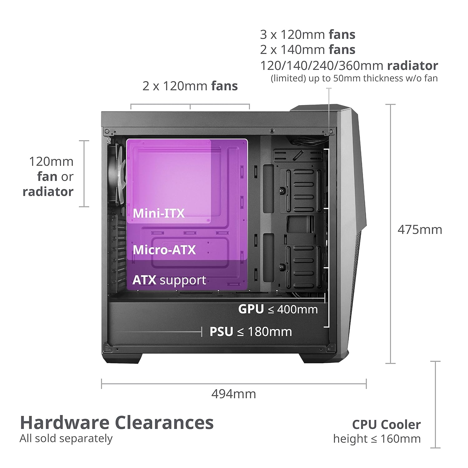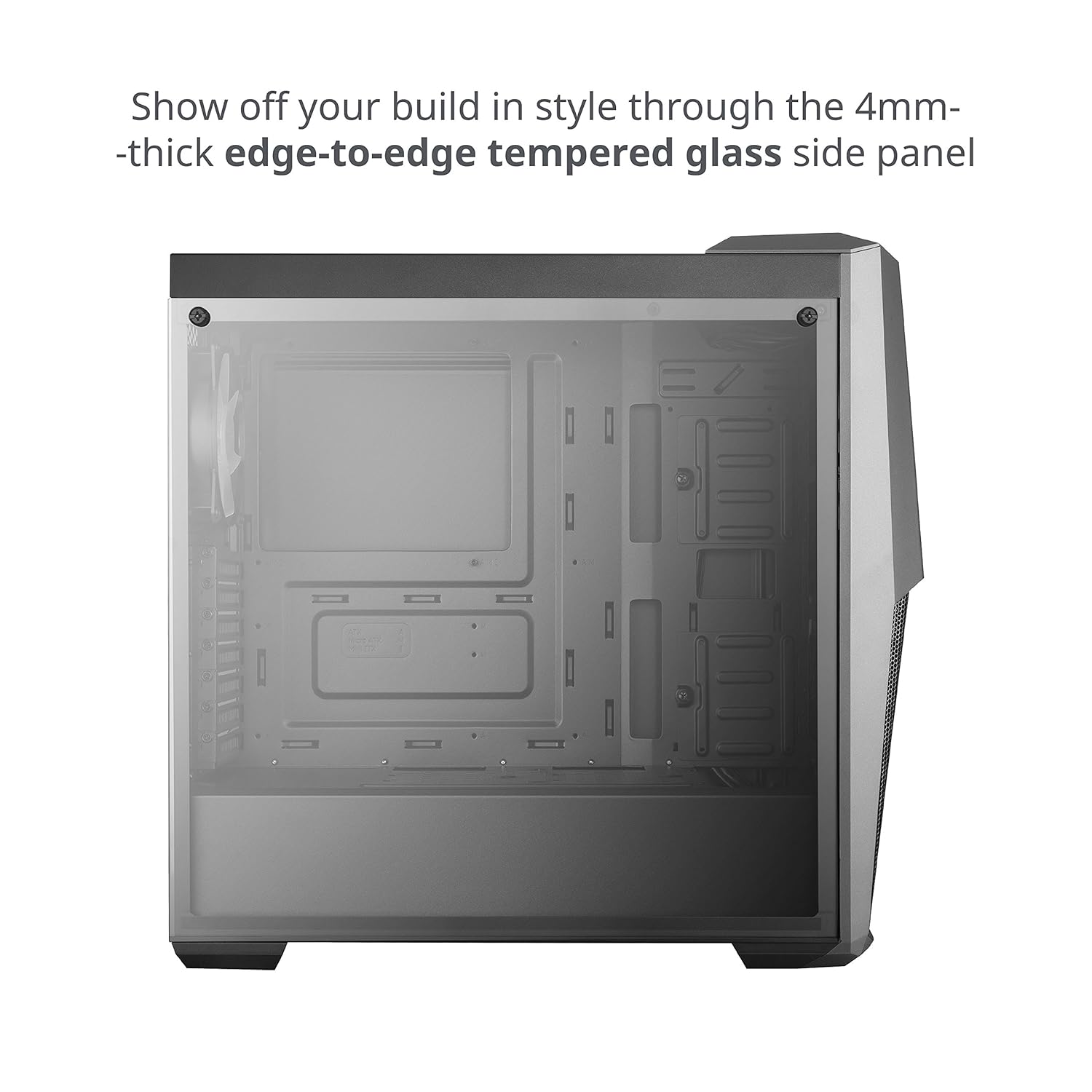 A semi-meshed front panel and ventilation holes on top will allow more airflow from the two pre-installed 120mm RGB fans in the front and one 120mm RGB fan in the rear. The excellent thermal performance and aggressive outlook of the Master Box MB500 make it a perfect choice for Gamers and PC enthusiasts. The spacious interior and two chamber design allows you to assemble the case faster and cleaner. It can support up to a 360mm radiator, 400mm in length for graphic card, 160mm in height for CPU cooler and 180mm in length for PSU. Show off your unique build through the 4mm thick edge-to-edge tempered glass side panel. |