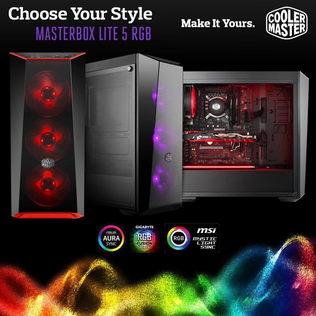 The MasterBox Lite 5 RGB is an ATX case and is your straightforward option for your PC build that doesn't ignore good looks, customization or performance. A sleek dark mirror front panel and three custom trim colors (included in the box) offer a great first entry point for customization. The spacious interior features black coating and a PSU cover that allows for easy, clean configurations for your build. Additionally, it comes with an edge to edge transparent tempered glass side panel to show your internal components. The case comes with three 3 RGB fans and a 3 to 1 splitter cable for the RGB fans. And with support for up to 4 cooling fans and a water-cooling system, we ensure your performance will not suffer. |