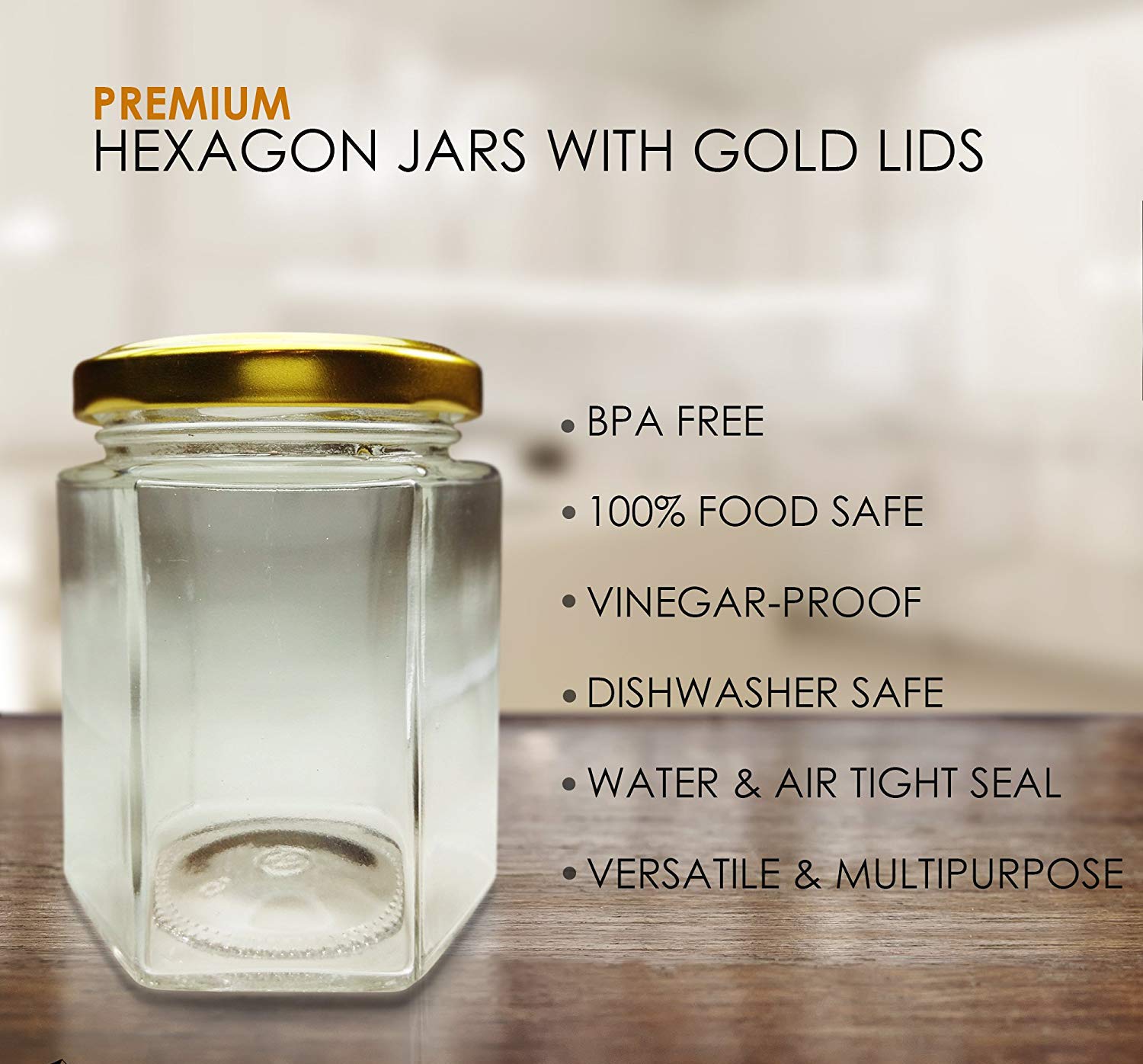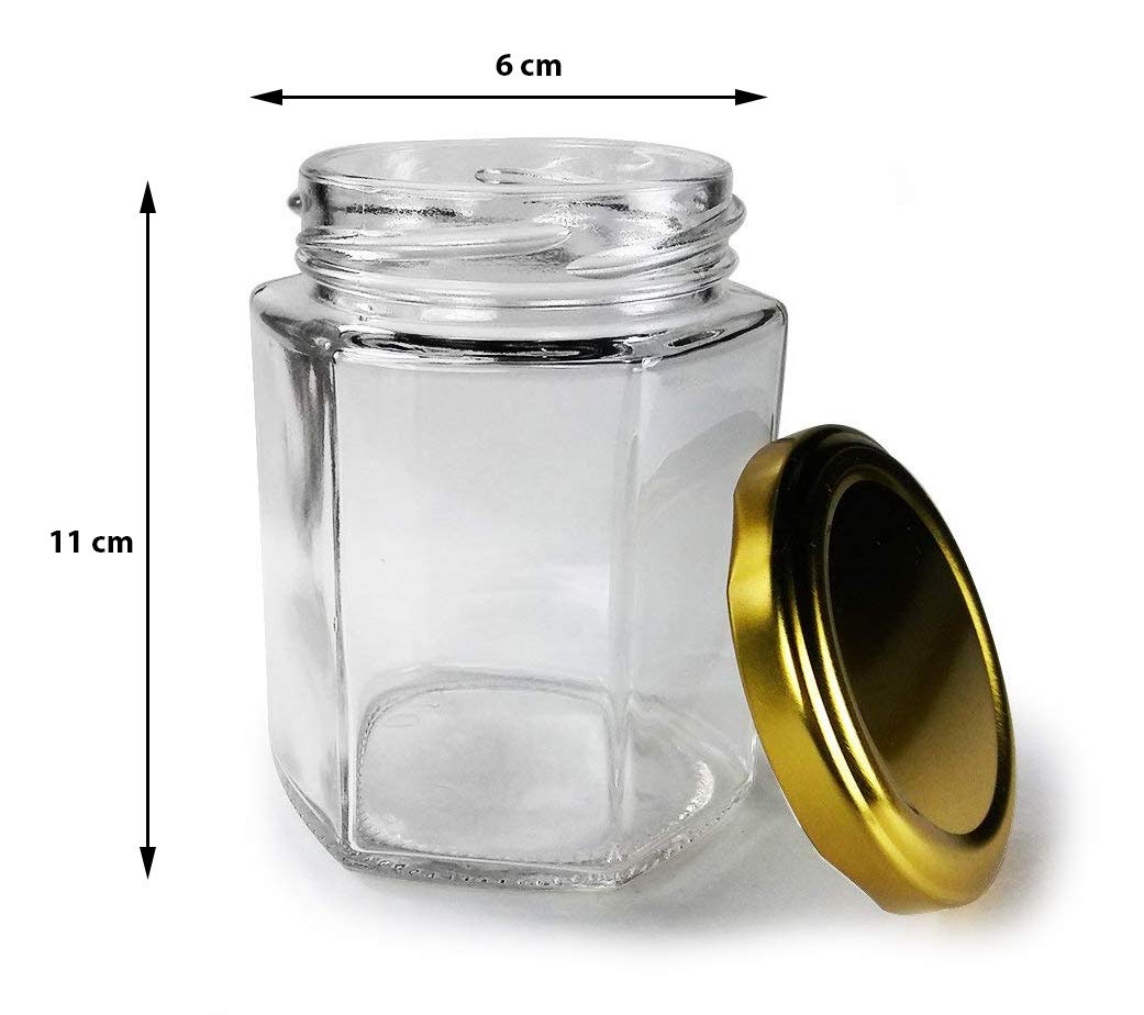 Crystalware Hexagon Glass Jar with Air Tight Gold Metal Cap, 200 ml (12)