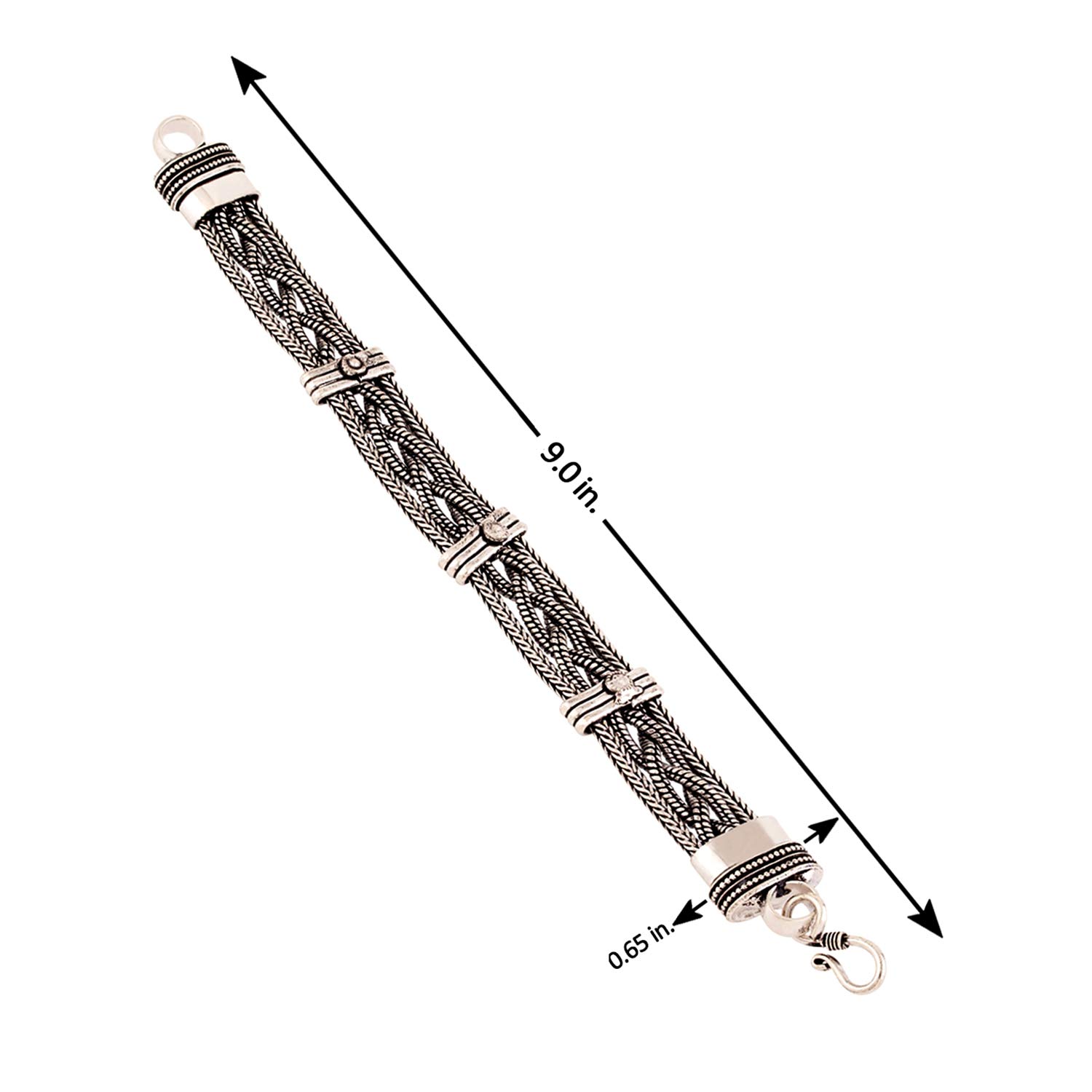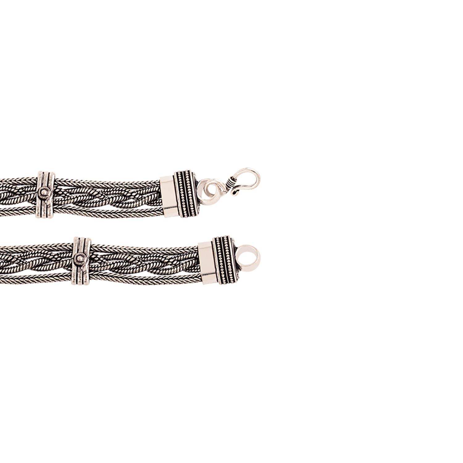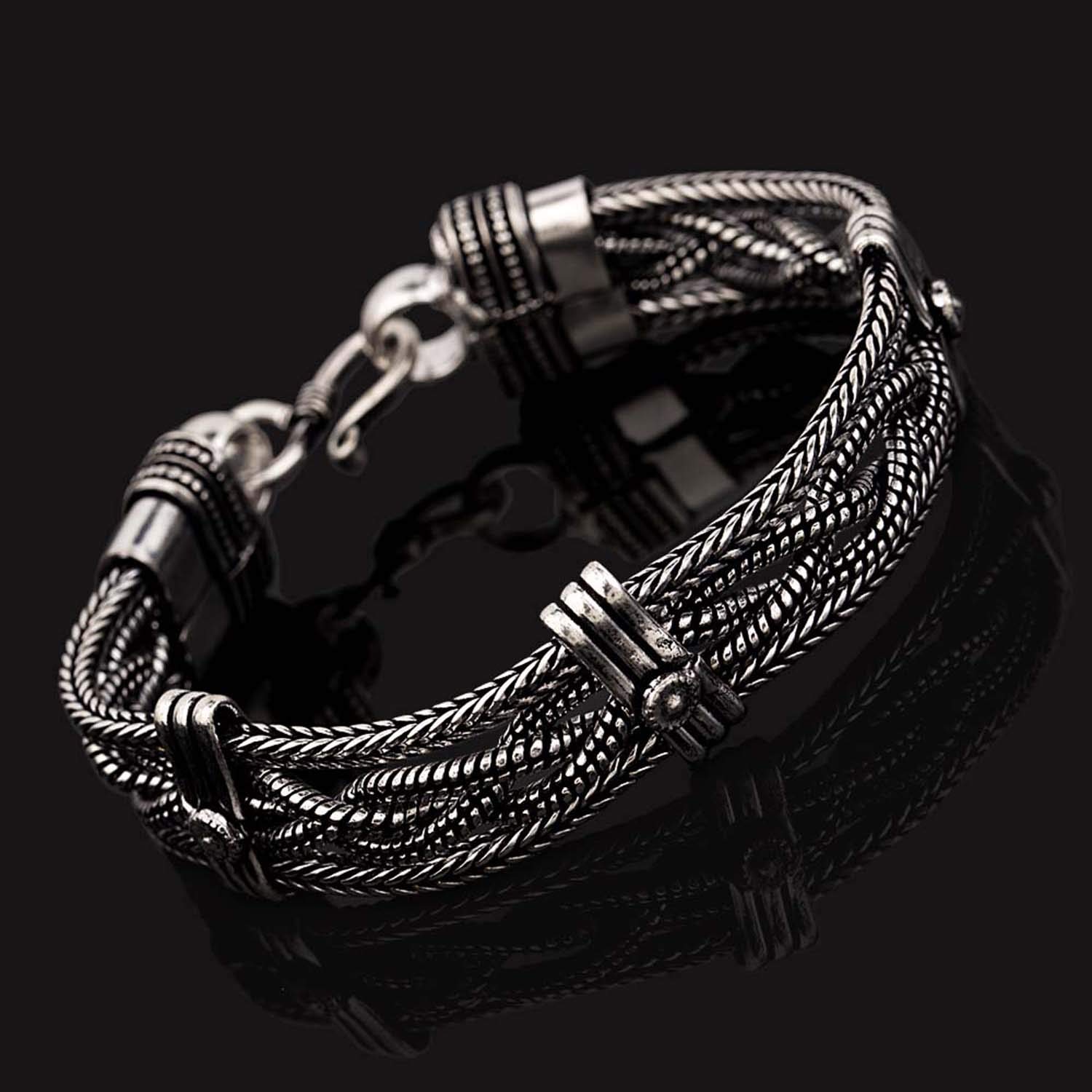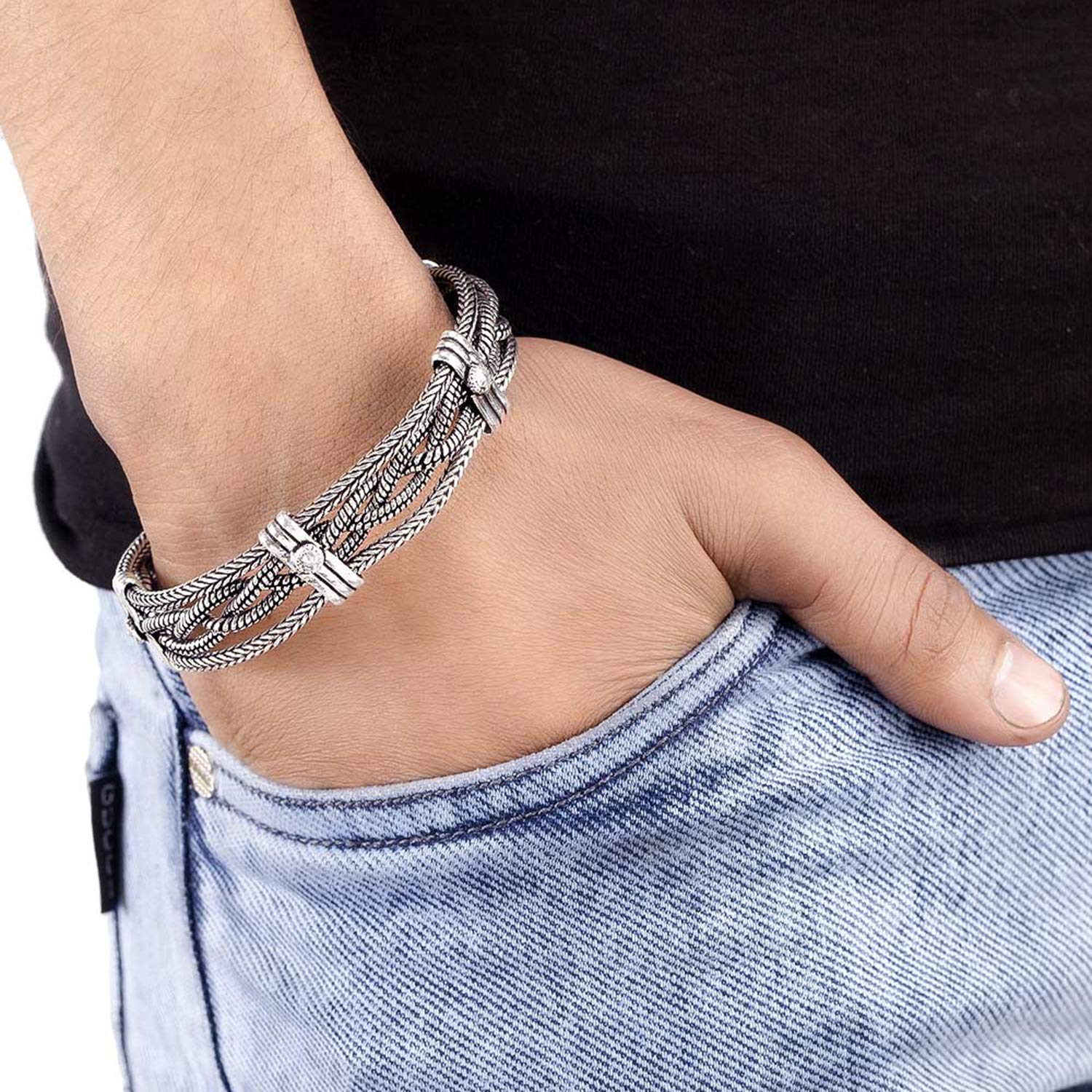 Men's silver plated bracelet fashioned out of brass. Wear with party attire. To make your accessories last longer avoid harsh chemicals and moisture. Keep dry, clean with dry cloth and wear with panache. "India's largest fashion jewelry brand DARE, comes from the House of Voylla as a limited edition of handcrafted accessories for the modern Indian men. |