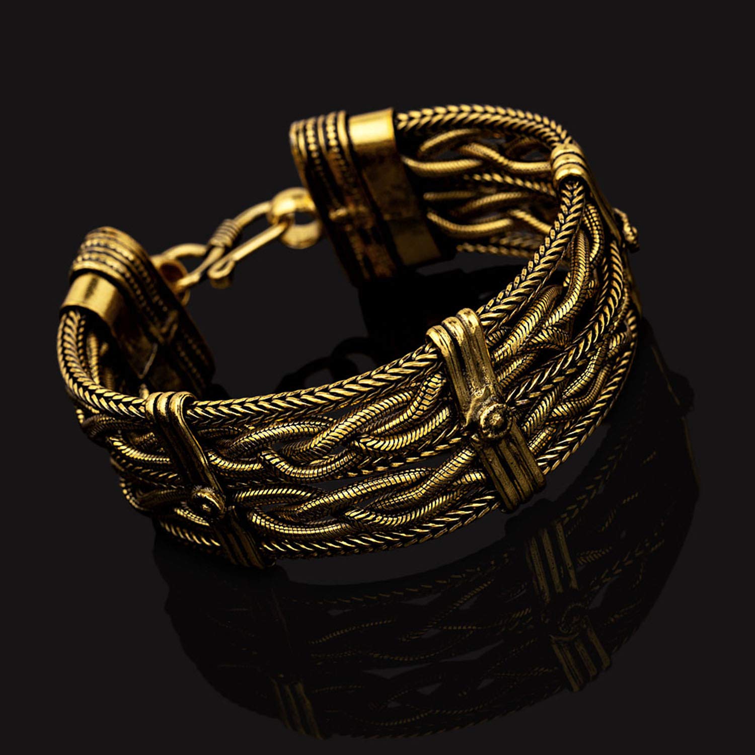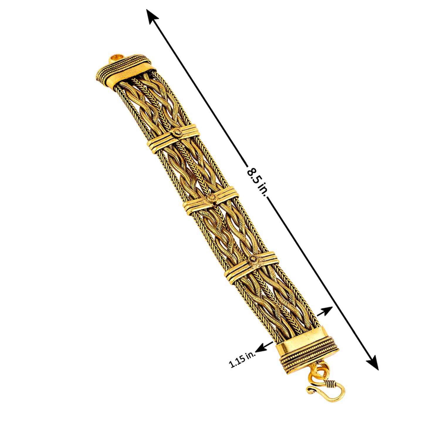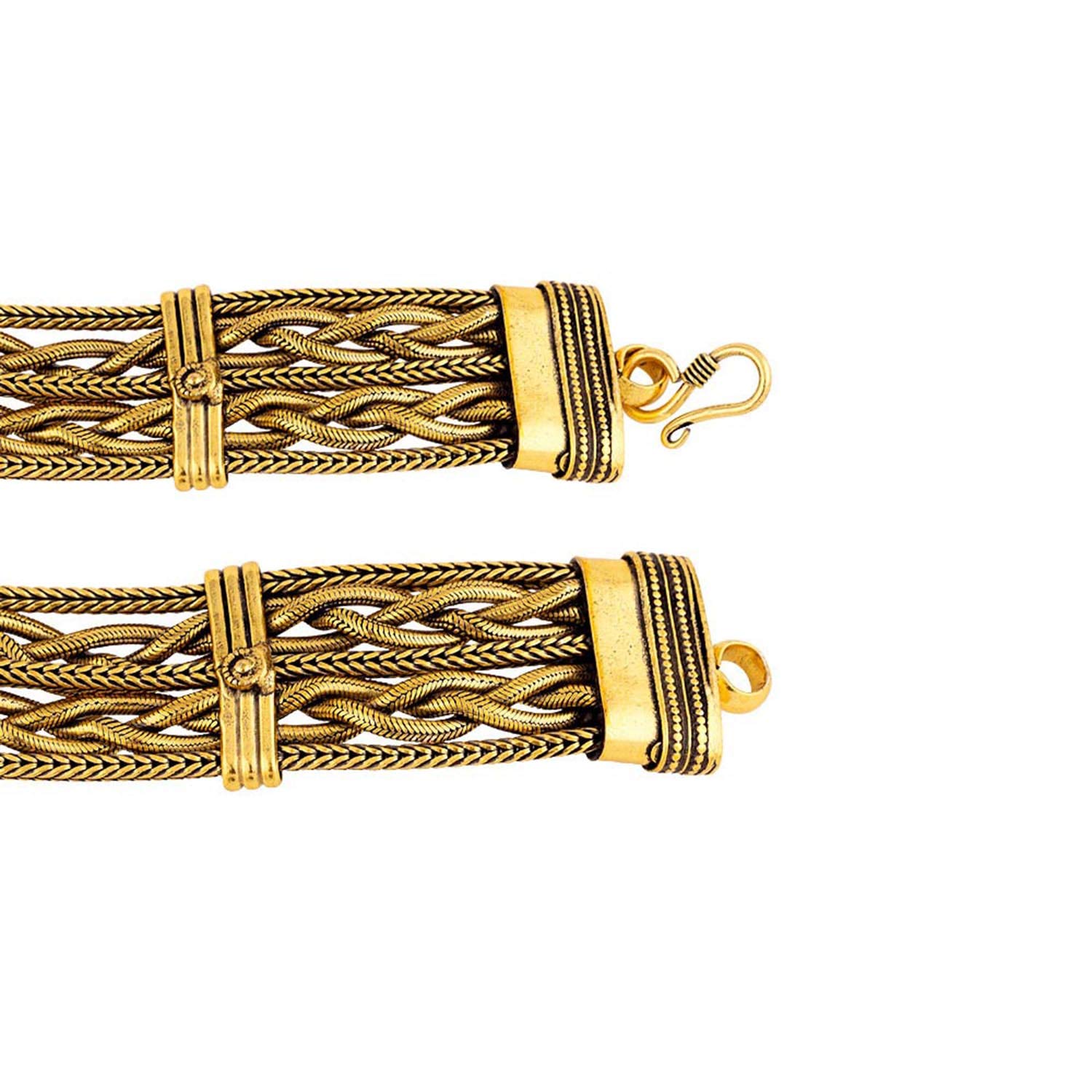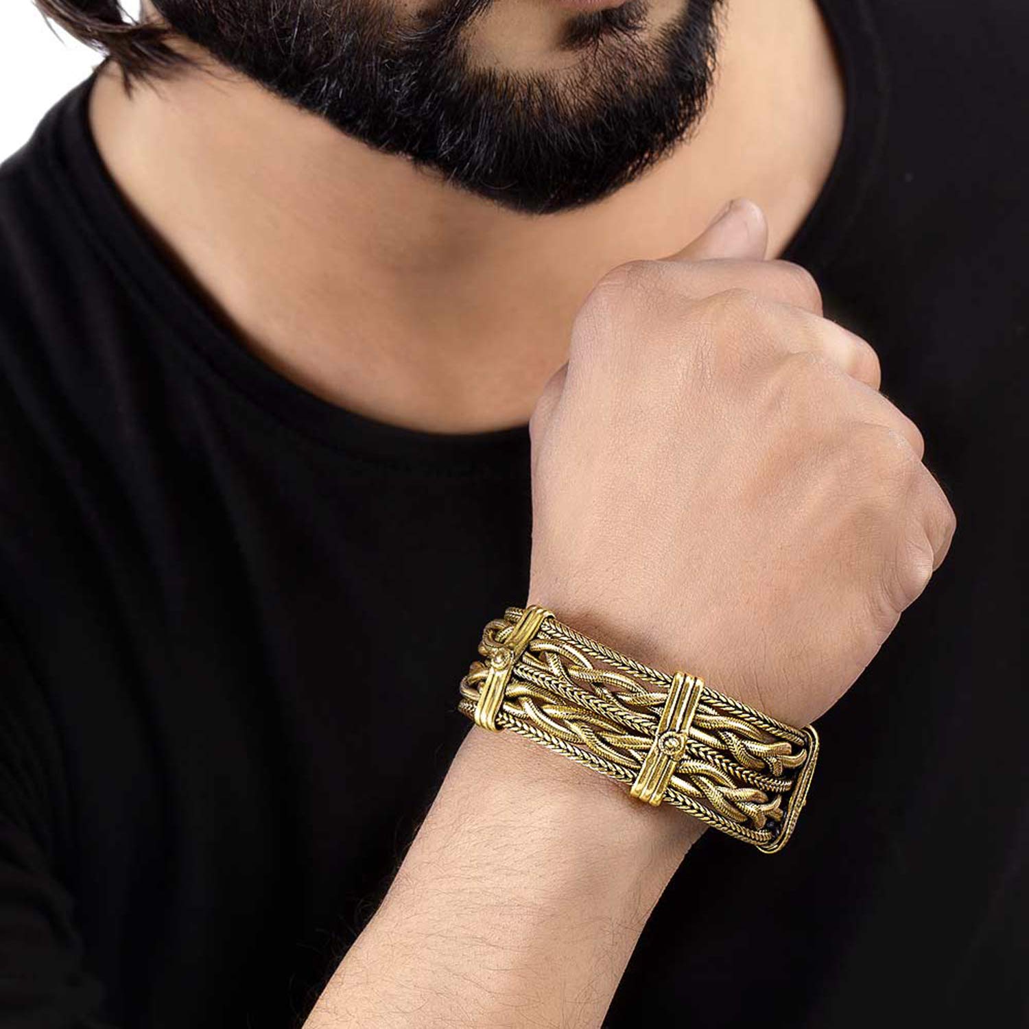 Yellow gold plated knotted bracelet for men. Fashioned out of brass. Wear with party attire. To make your accessories last longer avoid harsh chemicals and moisture. Keep dry, clean with dry cloth and wear with panache. "India's largest fashion jewelry brand DARE, comes from the House of Voylla as a limited edition of handcrafted accessories for the modern Indian men. |