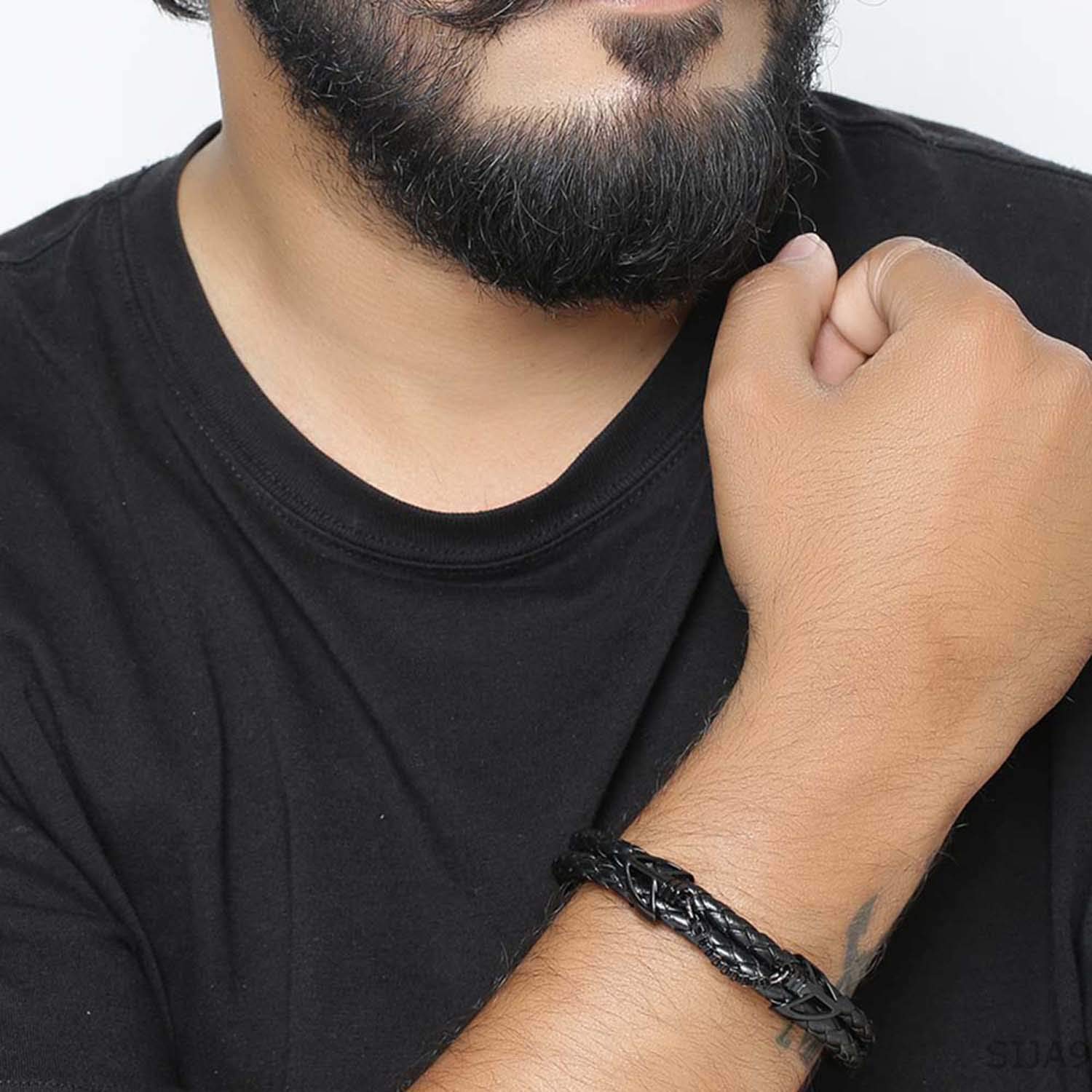 Black rhodium plated bracelet for men. Crafted from stainless steel. Pair with party outfits. To make your accessories last longer avoid harsh chemicals and moisture. Keep dry, clean with dry cloth and wear with panache. "India�s largest fashion jewelry brand DARE, comes from the House of Voylla as a limited edition of handcrafted accessories for the modern Indian men. |