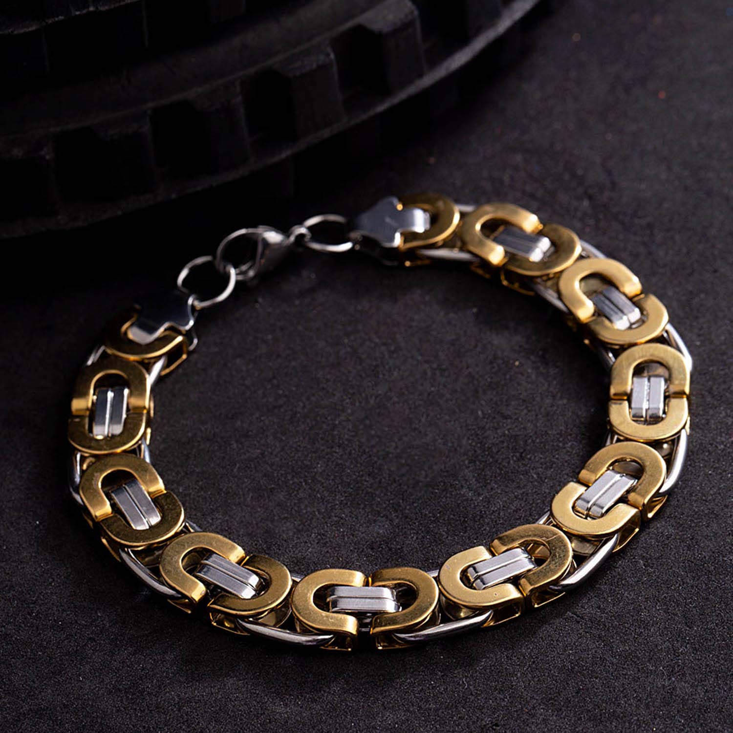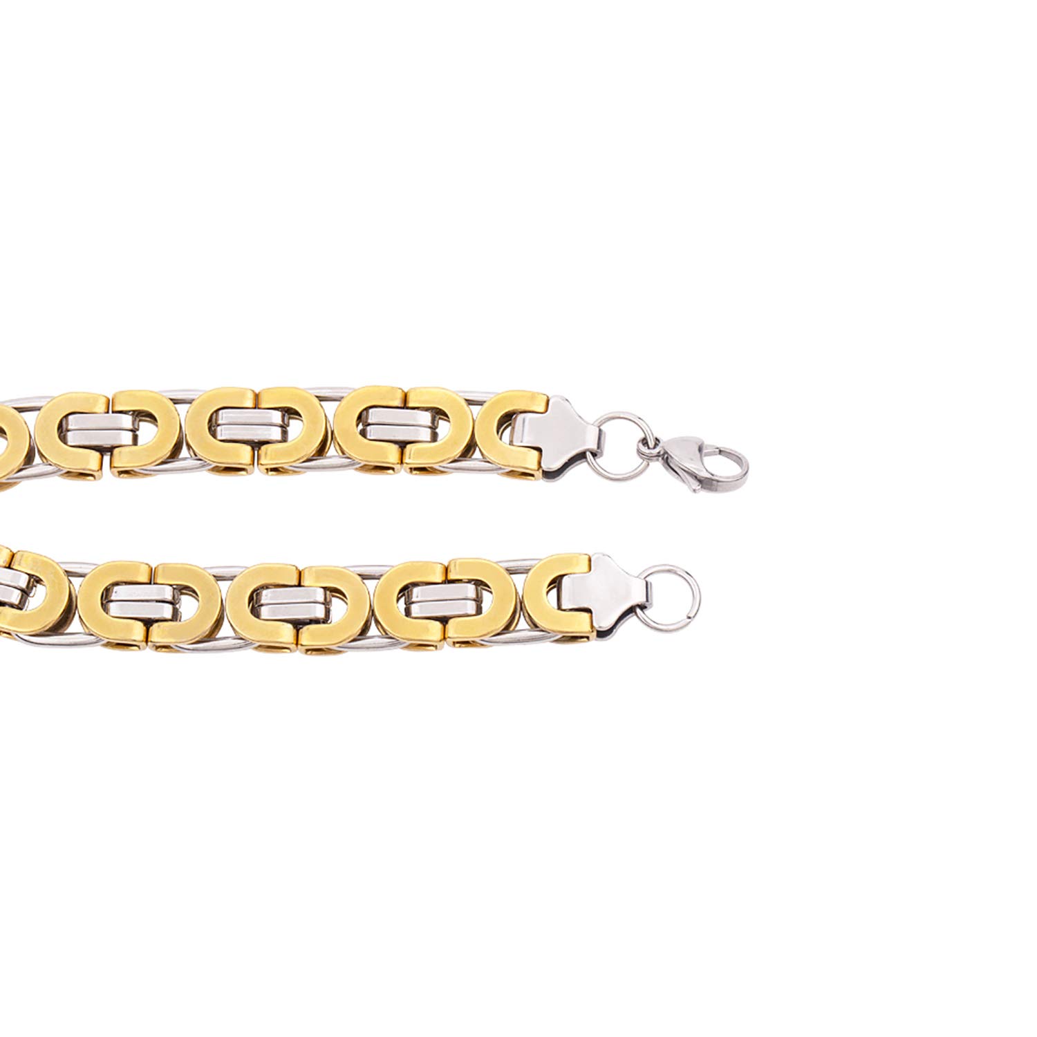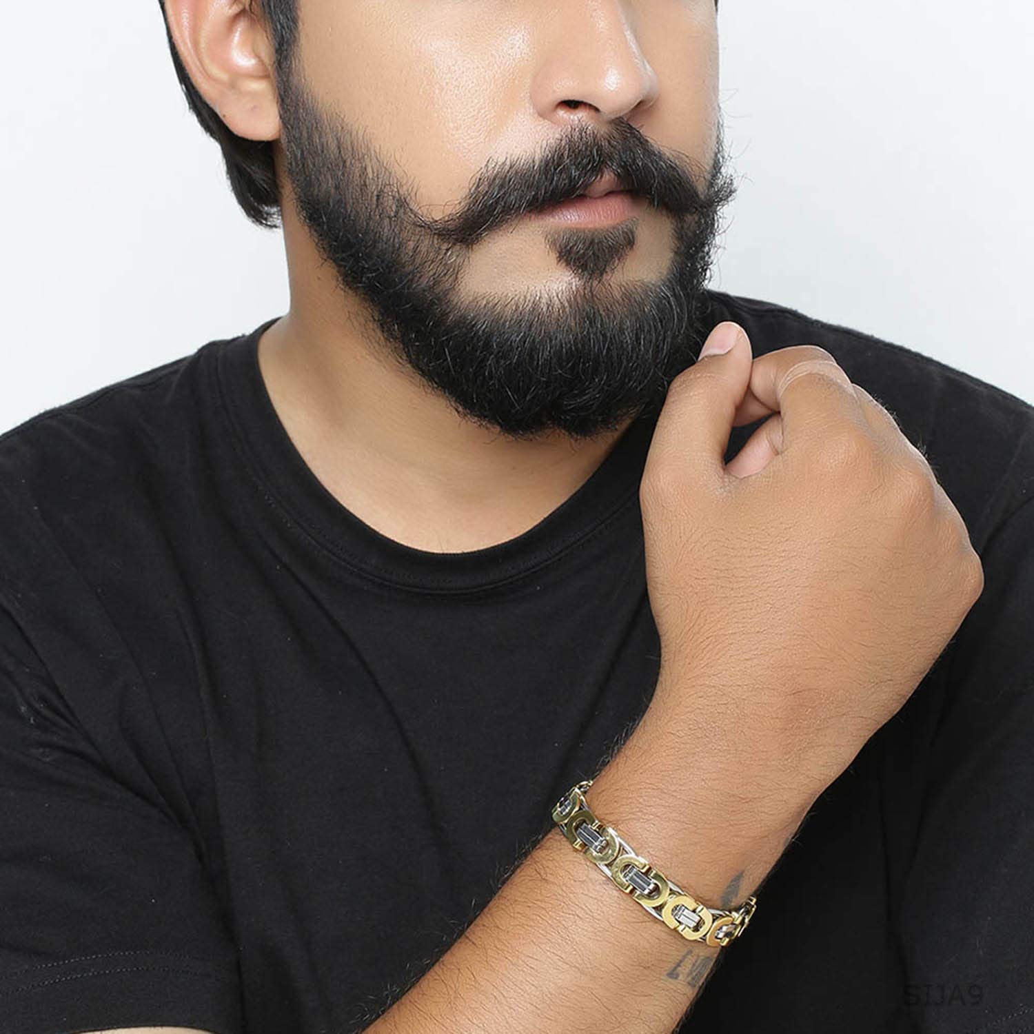 Men's stainless steel link pattern chain with two tone plating. Wear with formal looks. To make your accessories last longer avoid harsh chemicals and moisture. Keep dry, clean with dry cloth and wear with panache. "India's largest fashion jewelry brand DARE, comes from the House of Voylla as a limited edition of handcrafted accessories for the modern Indian men. |
