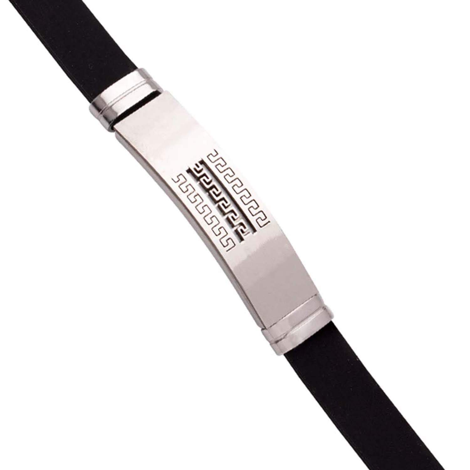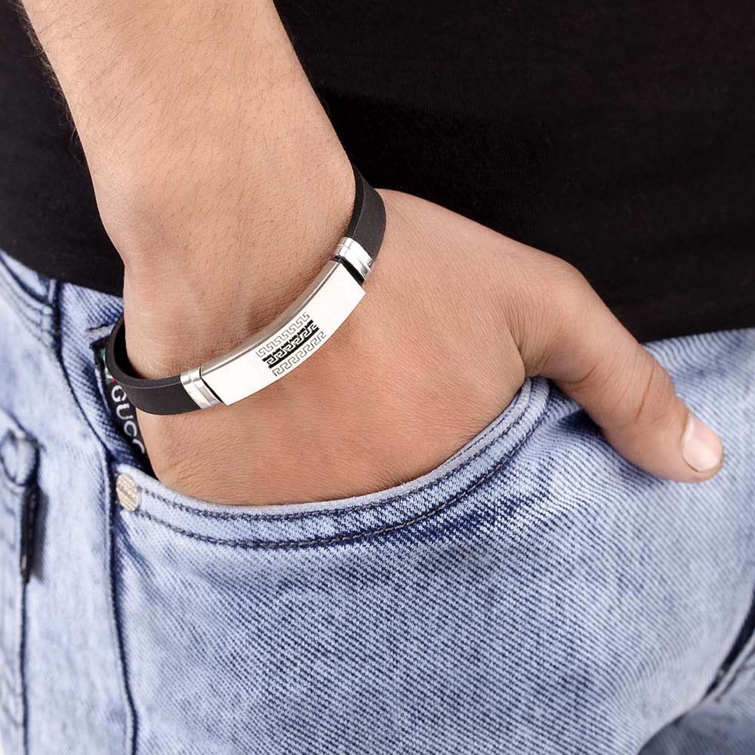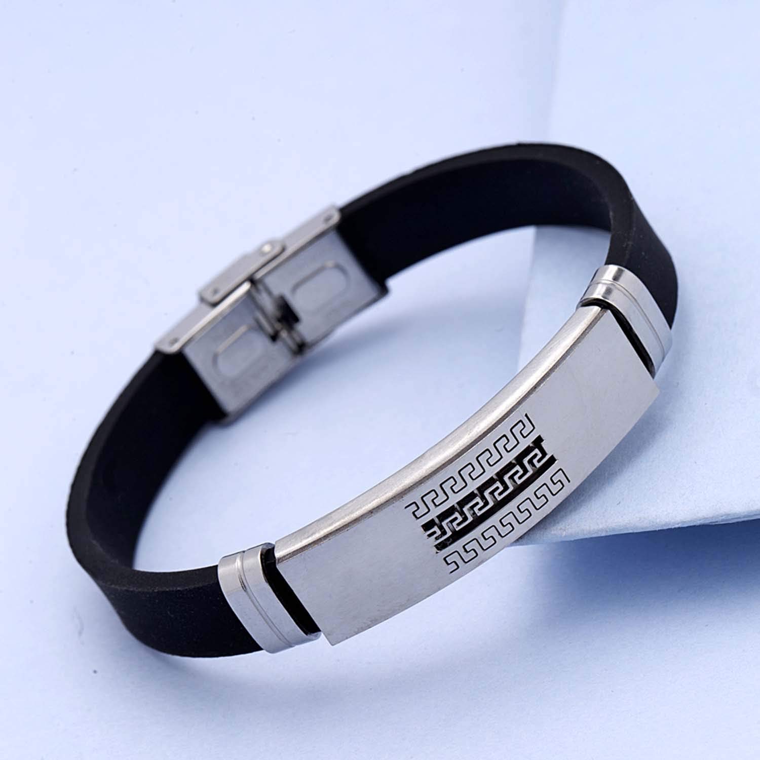 Aztec pattern embossed stainless steel bracelet. Silver plated and good for everyday wear. To make your accessories last longer avoid harsh chemicals and moisture. Keep dry, clean with dry cloth and wear with panache. "Indiaâ€s largest fashion jewelry brand DARE, comes from the House of Voylla as a limited edition of handcrafted accessories for the modern Indian men. |