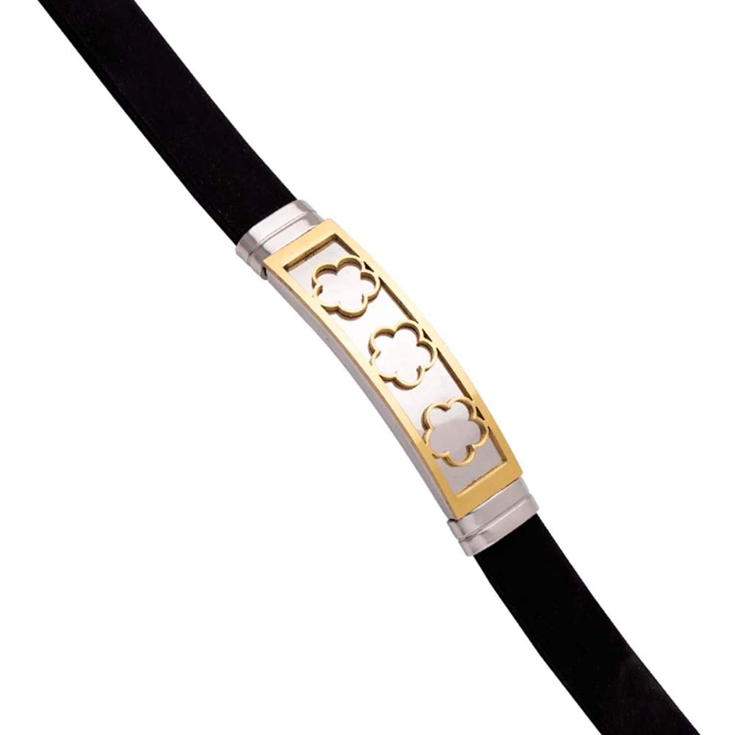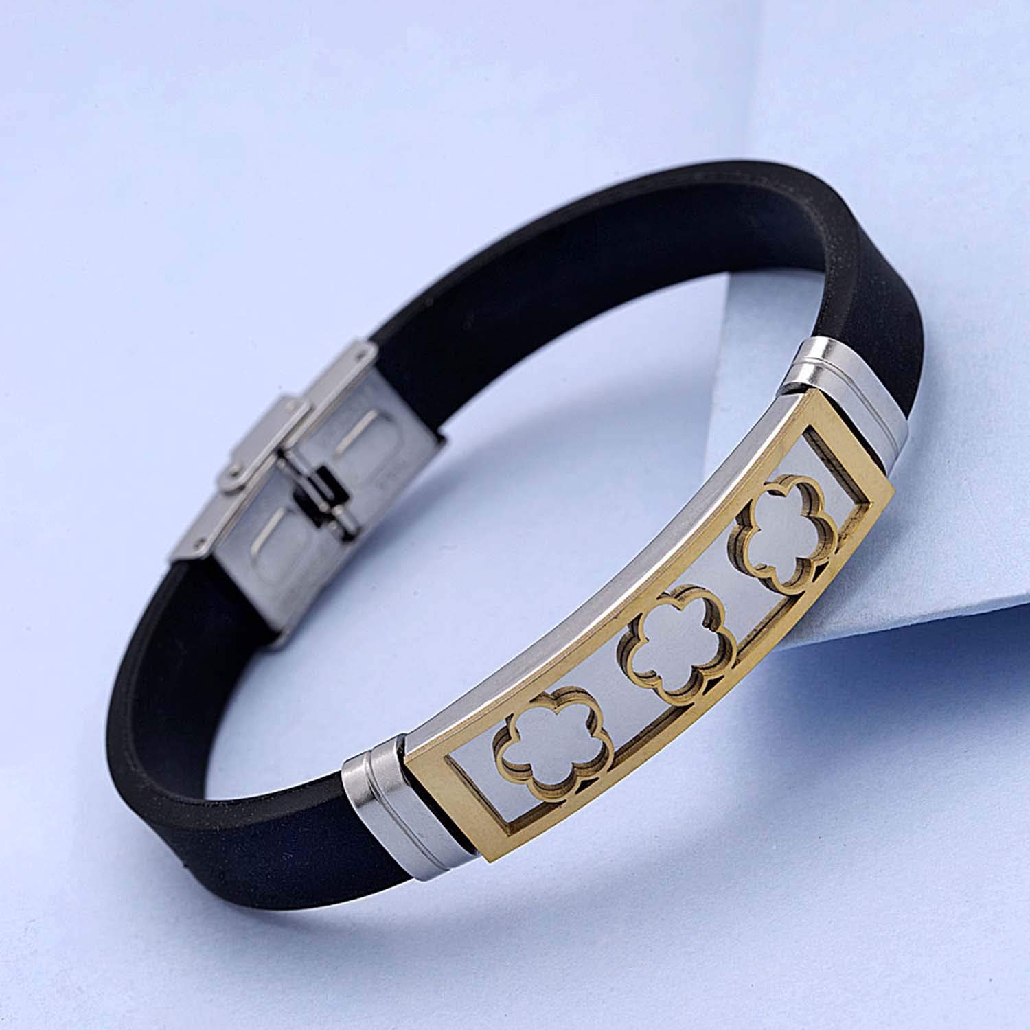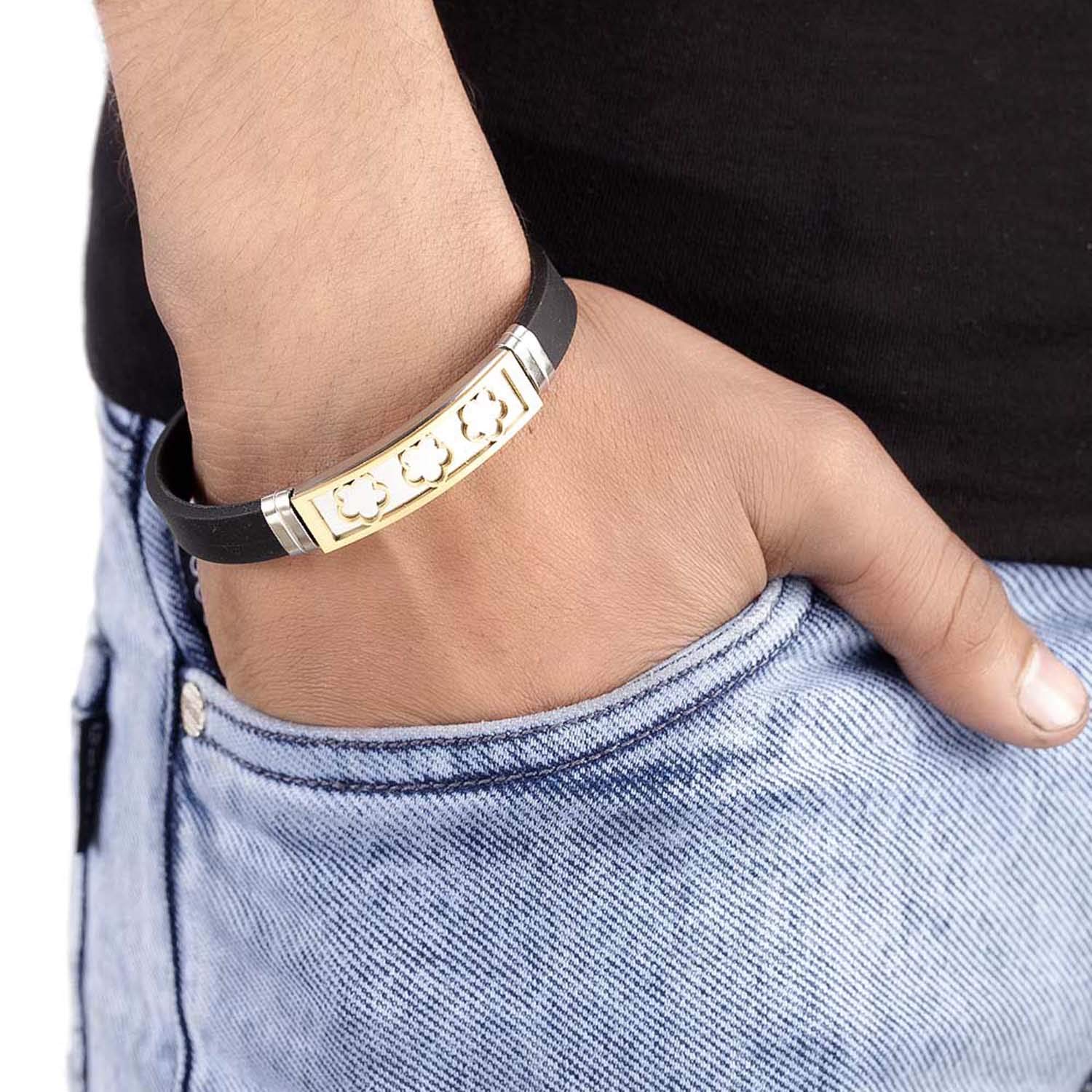 Clover leaves motifs bracelet made from stainless steel. Pair the two tone plated bracelet with a party outfit. To make your accessories last longer avoid harsh chemicals and moisture. Keep dry, clean with dry cloth and wear with panache. "Indiaâ€s largest fashion jewelry brand DARE, comes from the House of Voylla as a limited edition of handcrafted accessories for the modern Indian men. |