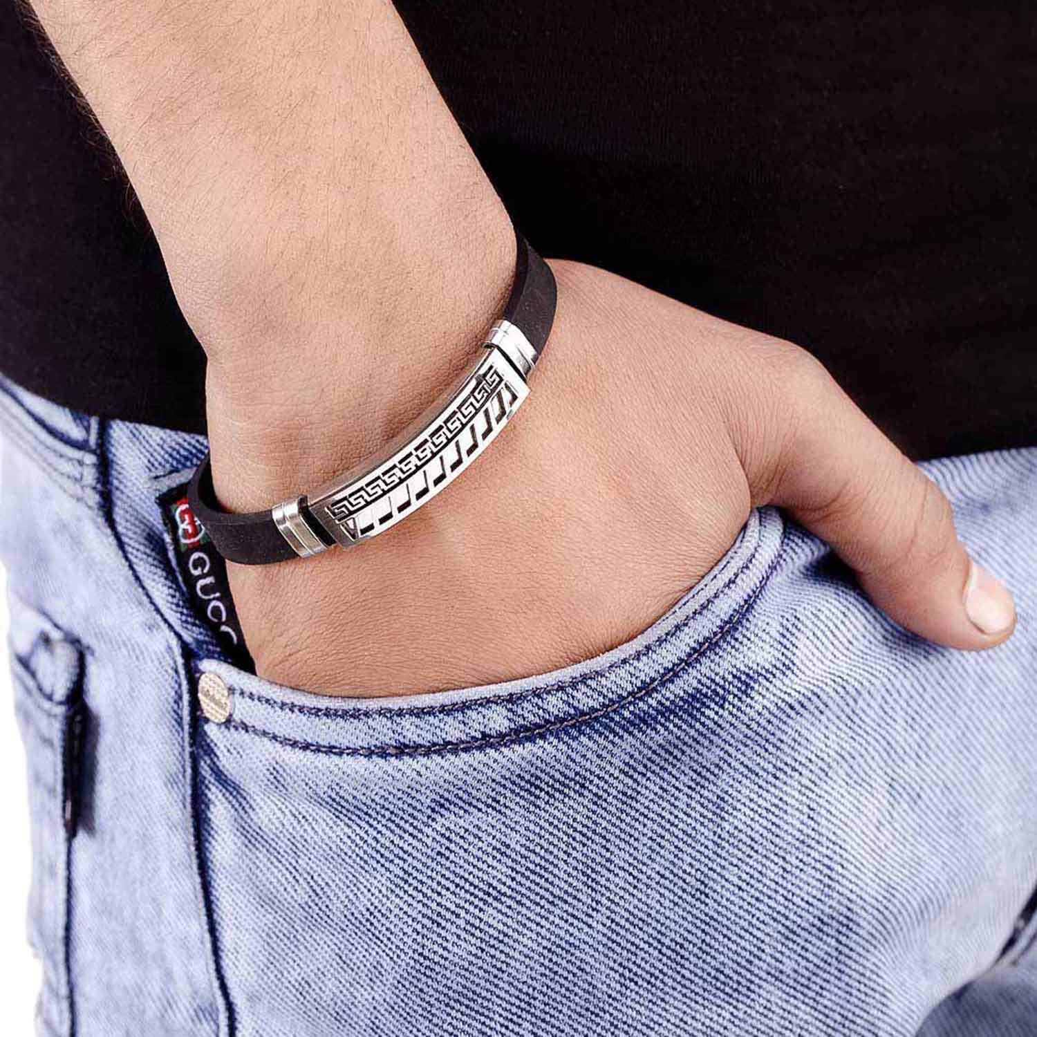 Cutwork pattern bracelet made from stainless steel and silver plated. Wear with a casual t-shirt. To make your accessories last longer avoid harsh chemicals and moisture. Keep dry, clean with dry cloth and wear with panache. "Indiaâ€s largest fashion jewelry brand DARE, comes from the House of Voylla as a limited edition of handcrafted accessories for the modern Indian men. |