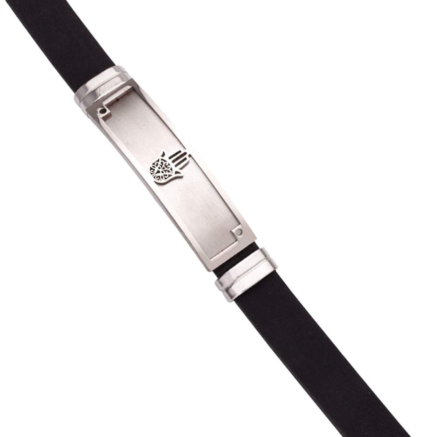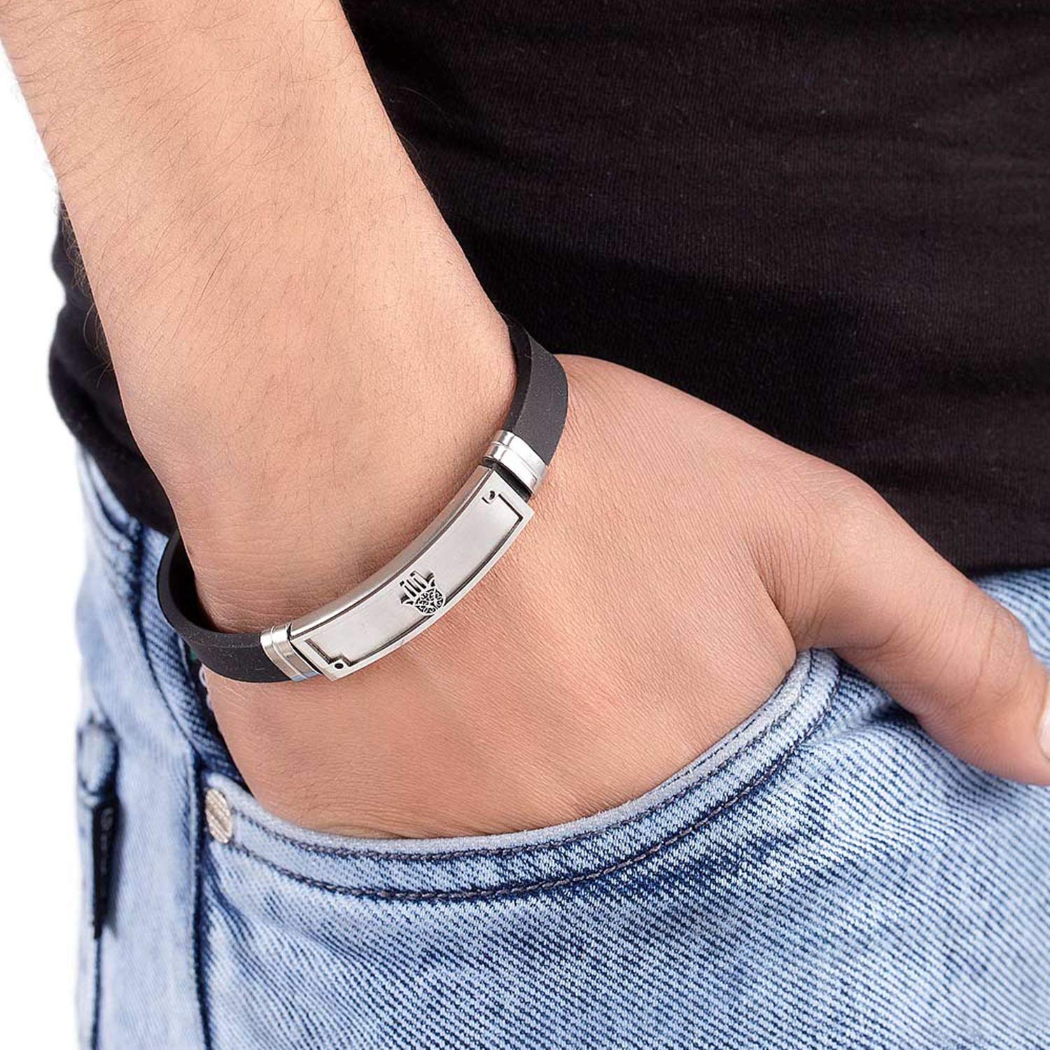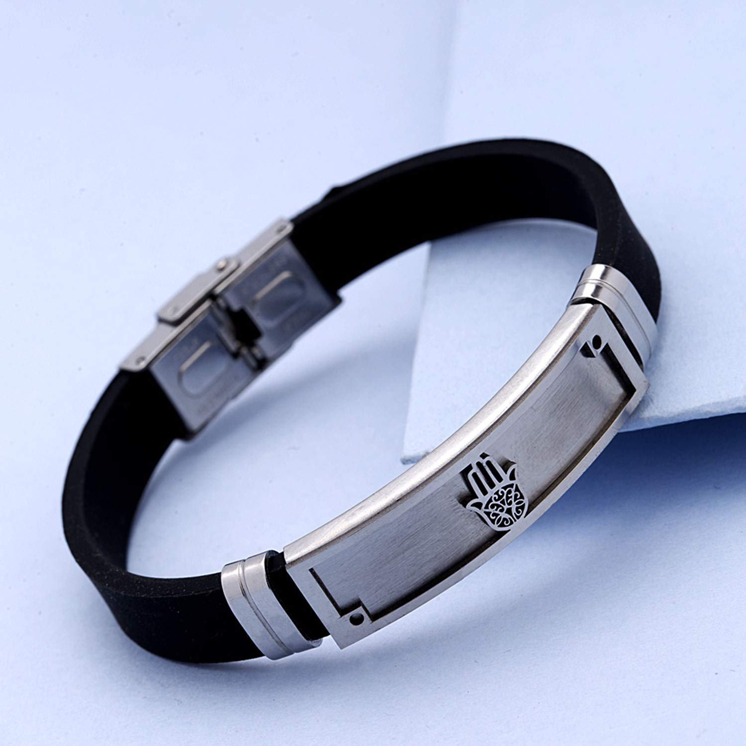 Hamsa motif embossed bracelet. Made from stainless steel and silver plated. Good match for casual looks. To make your accessories last longer avoid harsh chemicals and moisture. Keep dry, clean with dry cloth and wear with panache. "Indiaâ€s largest fashion jewelry brand DARE, comes from the House of Voylla as a limited edition of handcrafted accessories for the modern Indian men. |