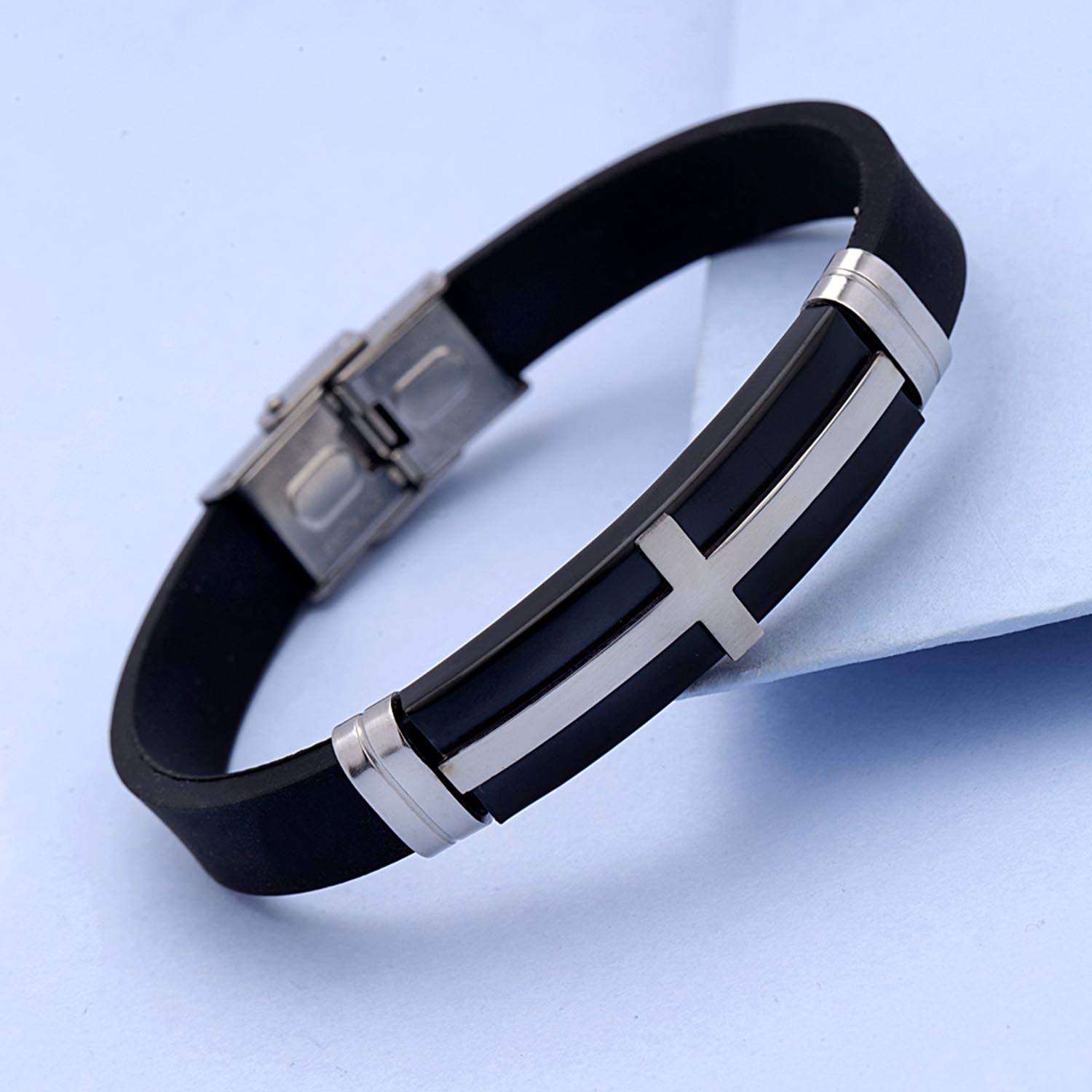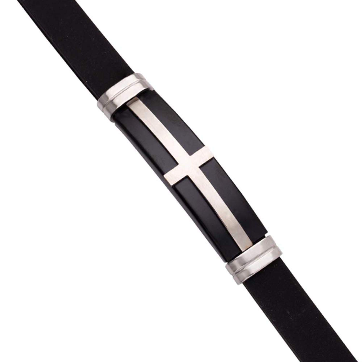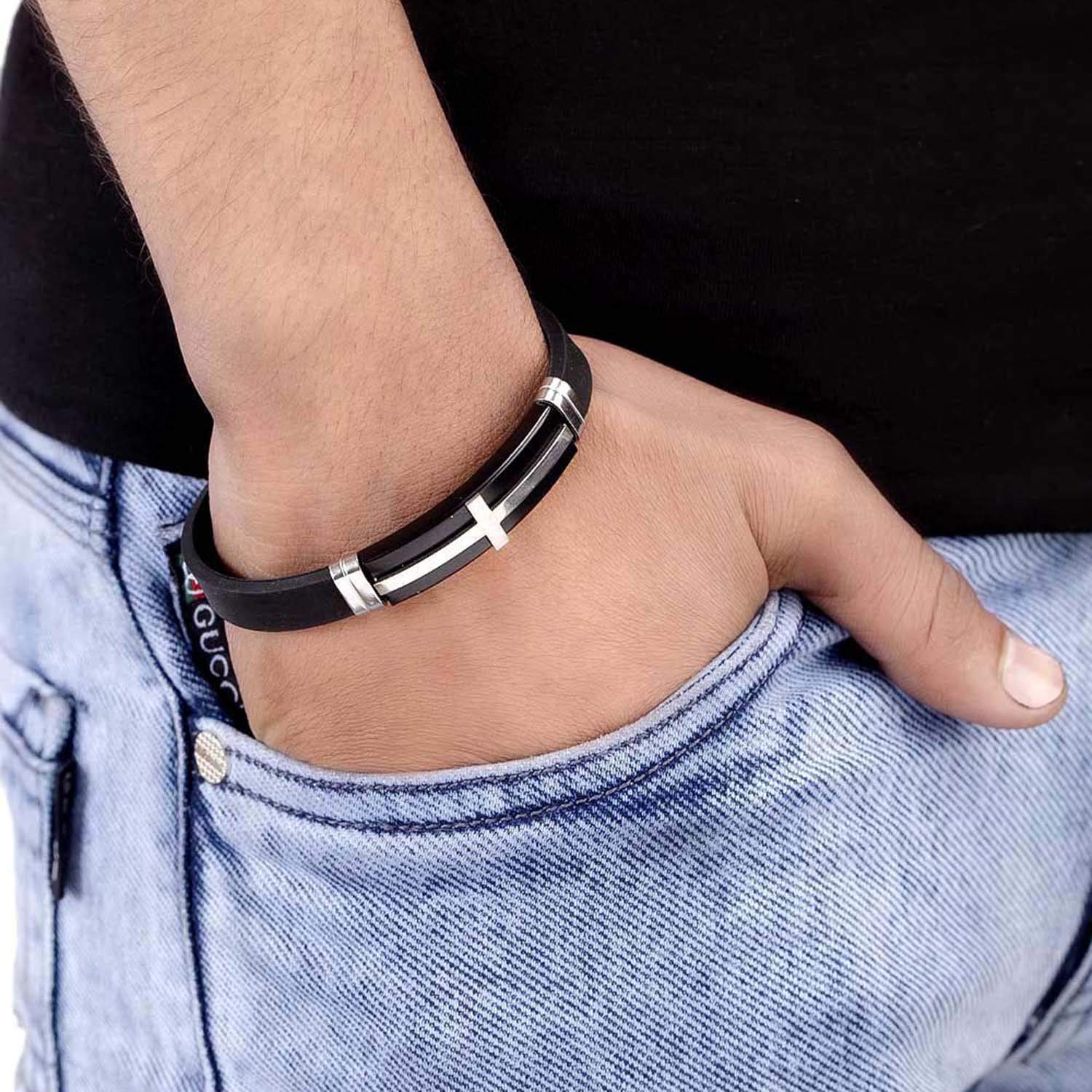Long cross motif bracelet made from stainless steel. Wear the silver plated accessory with a formal party outfit. To make your accessories last longer avoid harsh chemicals and moisture. Keep dry, clean with dry cloth and wear with panache. "Indiaâ€s largest fashion jewelry brand DARE, comes from the House of Voylla as a limited edition of handcrafted accessories for the modern Indian men. |