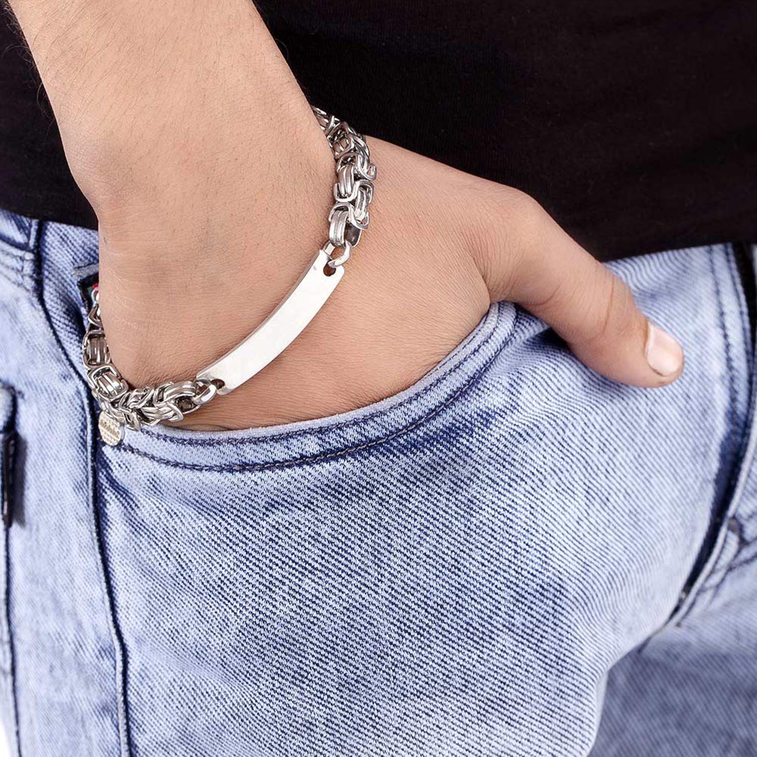 Stainless steel link bracelet for men, with silver plating. Wear with a casual jeans and t-shirt attire. To make your accessories last longer avoid harsh chemicals and moisture. Keep dry, clean with dry cloth and wear with panache. "Indiaâ€s largest fashion jewelry brand DARE, comes from the House of Voylla as a limited edition of handcrafted accessories for the modern Indian men. |