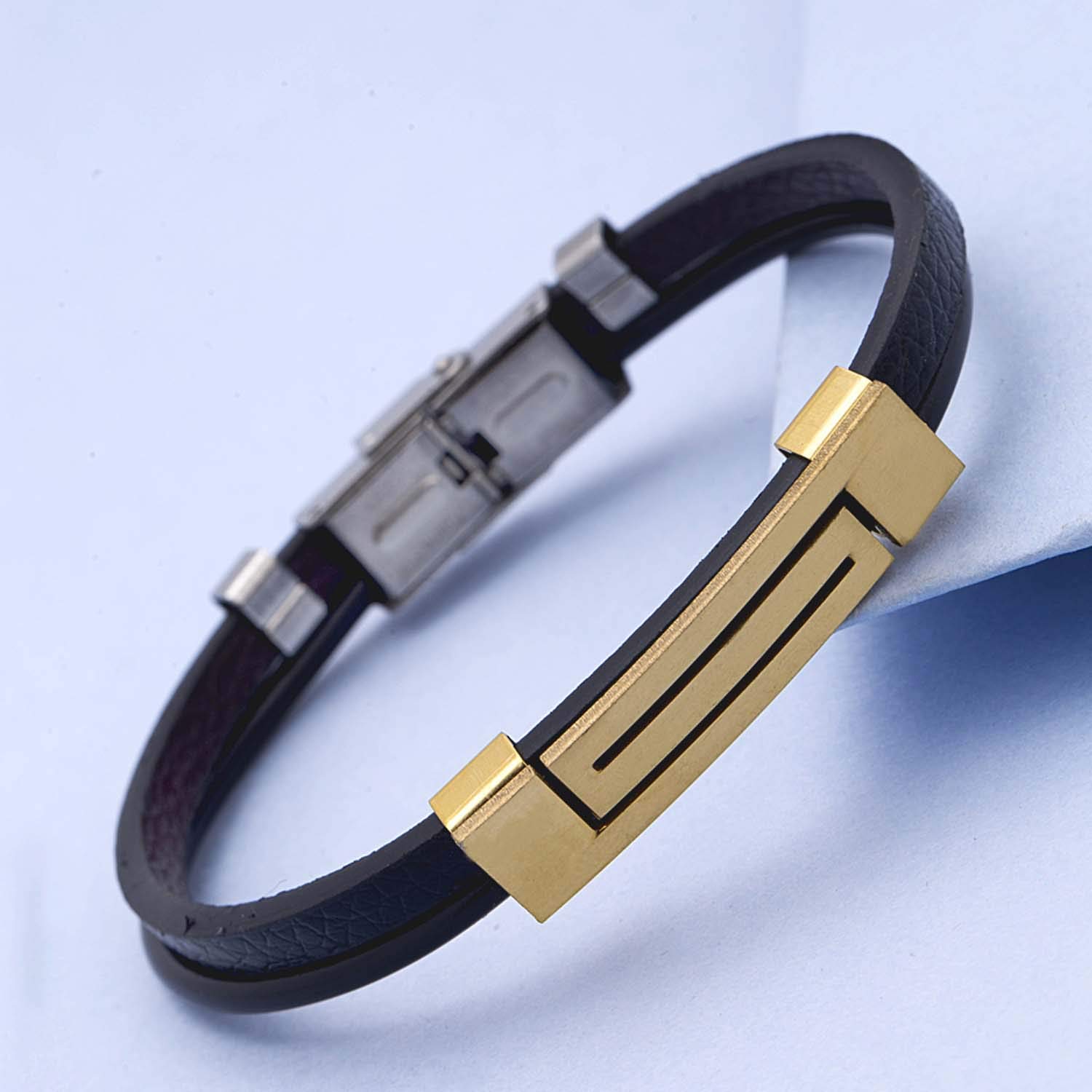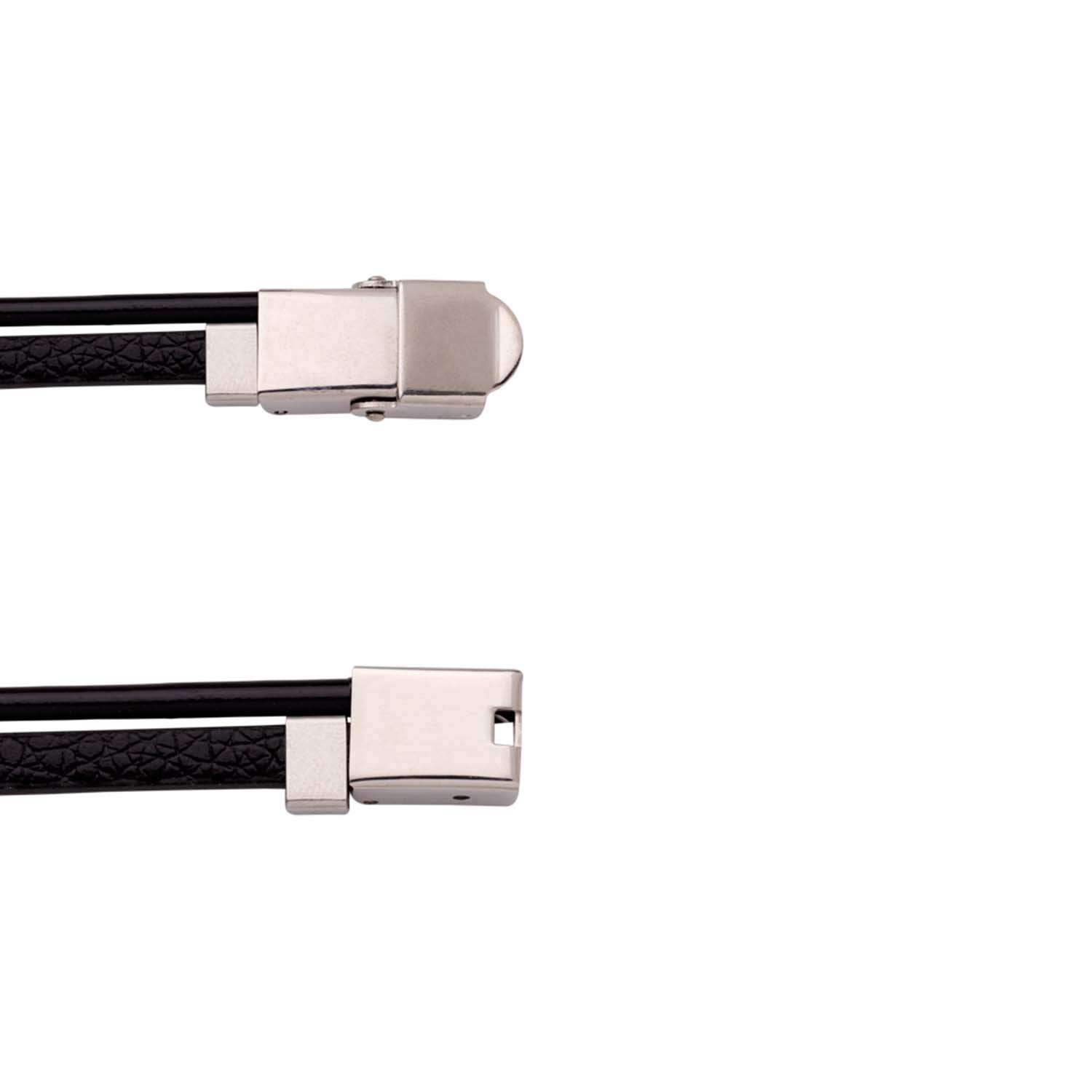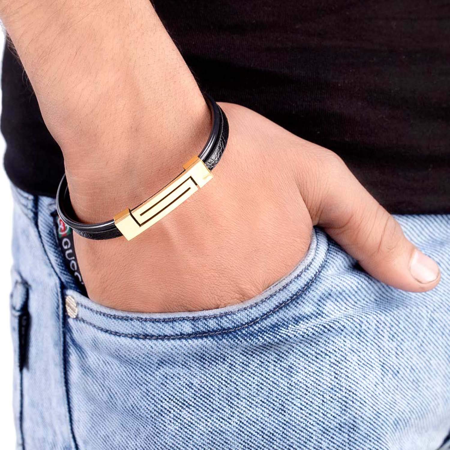 Two tone plated bold lines men's bracelet fashioned out of stainless steel. Good match for casual looks. To make your accessories last longer avoid harsh chemicals and moisture. Keep dry, clean with dry cloth and wear with panache. "Indiaâ€s largest fashion jewelry brand DARE, comes from the House of Voylla as a limited edition of handcrafted accessories for the modern Indian men. |
