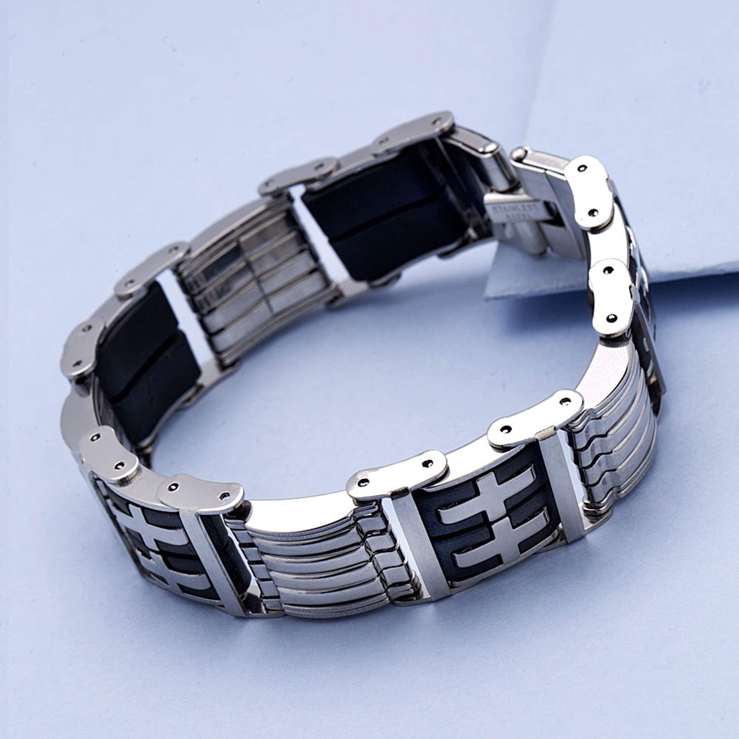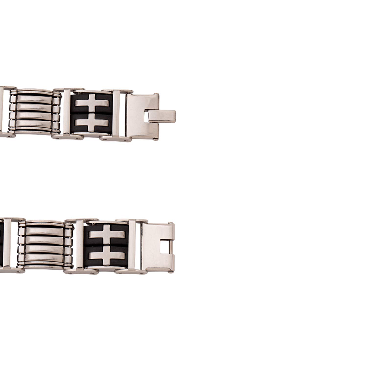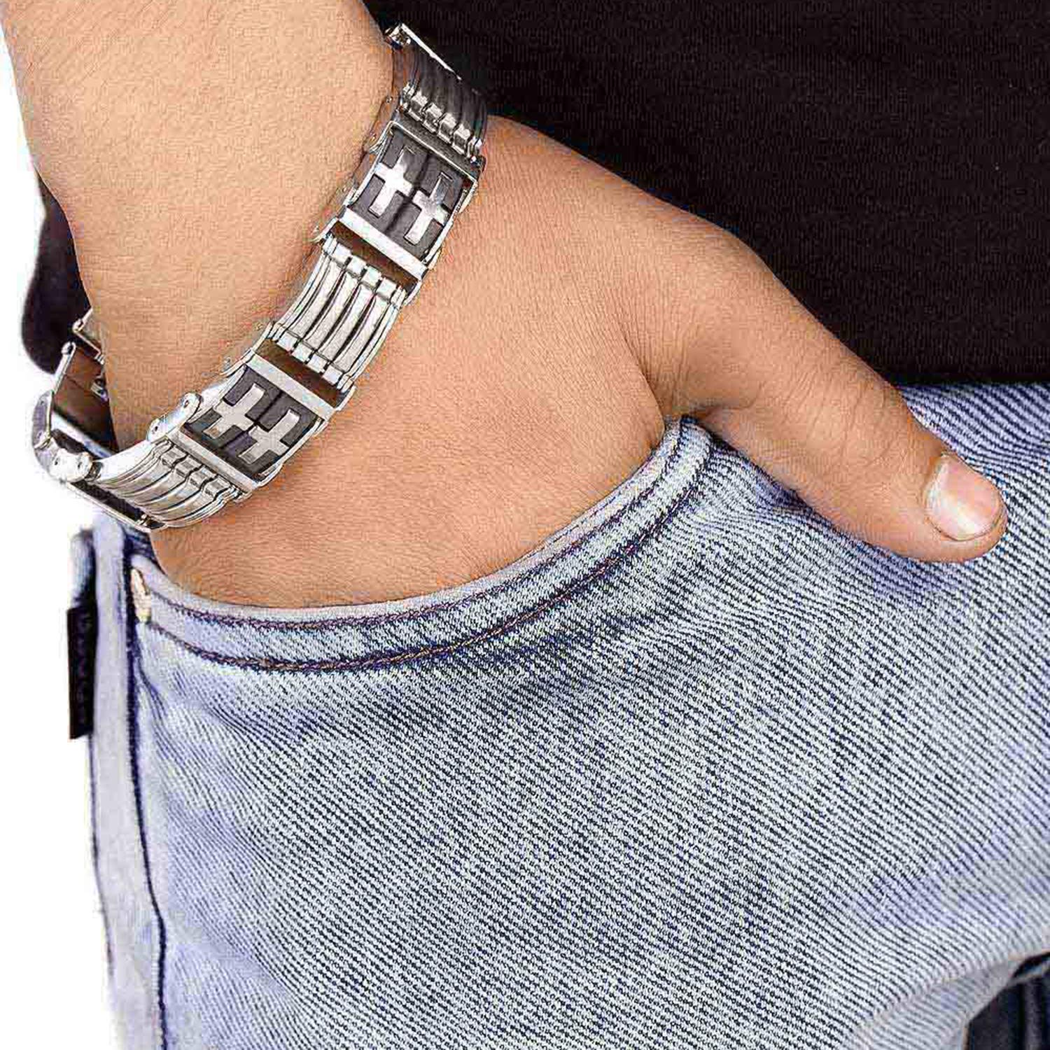 Silver plated bracelet for men made from stainless steel. Wear the link pattern bracelet with party attire. To make your accessories last longer avoid harsh chemicals and moisture. Keep dry, clean with dry cloth and wear with panache. "Indiaâ€s largest fashion jewelry brand DARE, comes from the House of Voylla as a limited edition of handcrafted accessories for the modern Indian men. |
