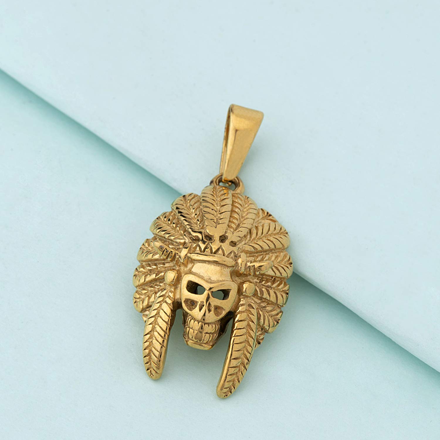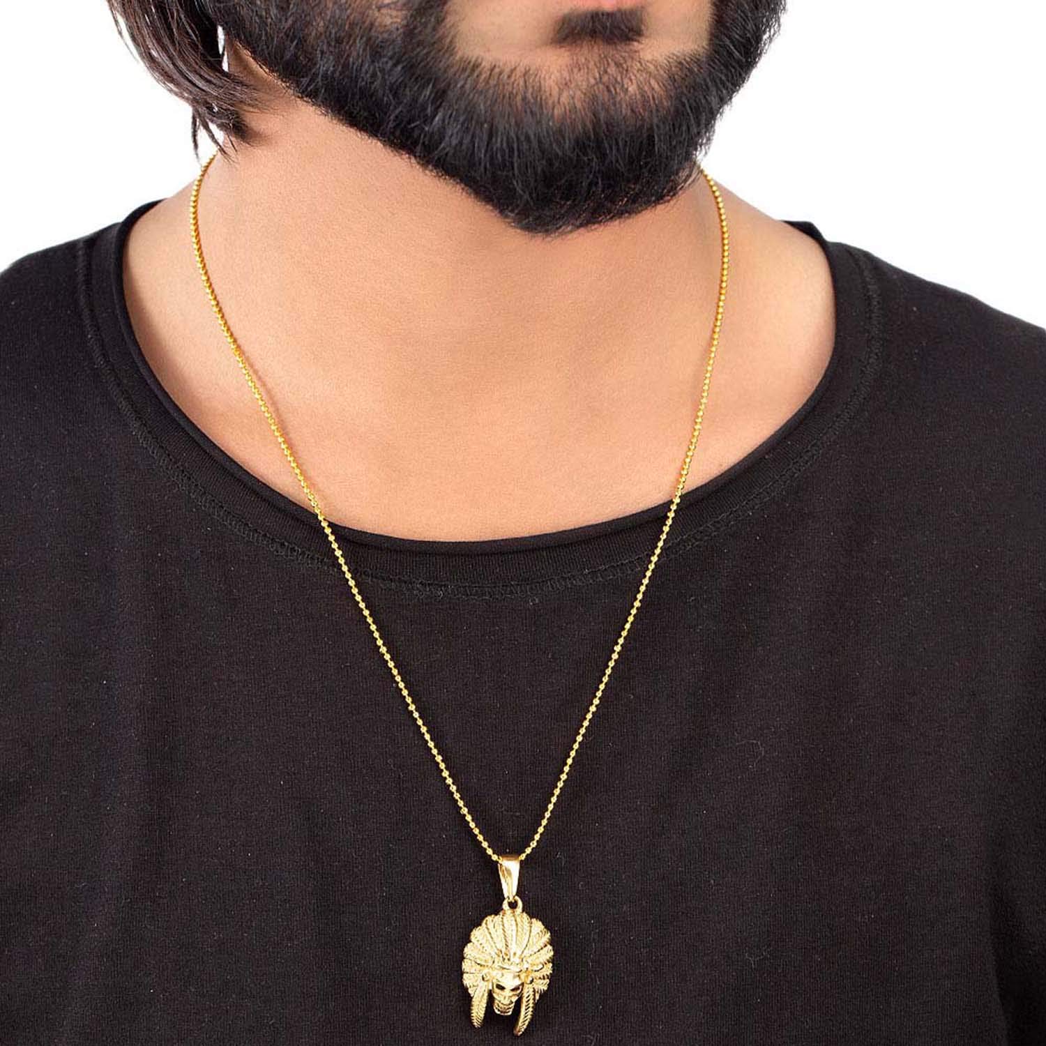 Stainless steel tribal mask pendant with yellow gold plating. Pair with party attire. To make your accessories last longer avoid harsh chemicals and moisture. Keep dry, clean with dry cloth and wear with panache. "Indiaâ€s largest fashion jewelry brand DARE, comes from the House of Voylla as a limited edition of handcrafted accessories for the modern Indian men. |