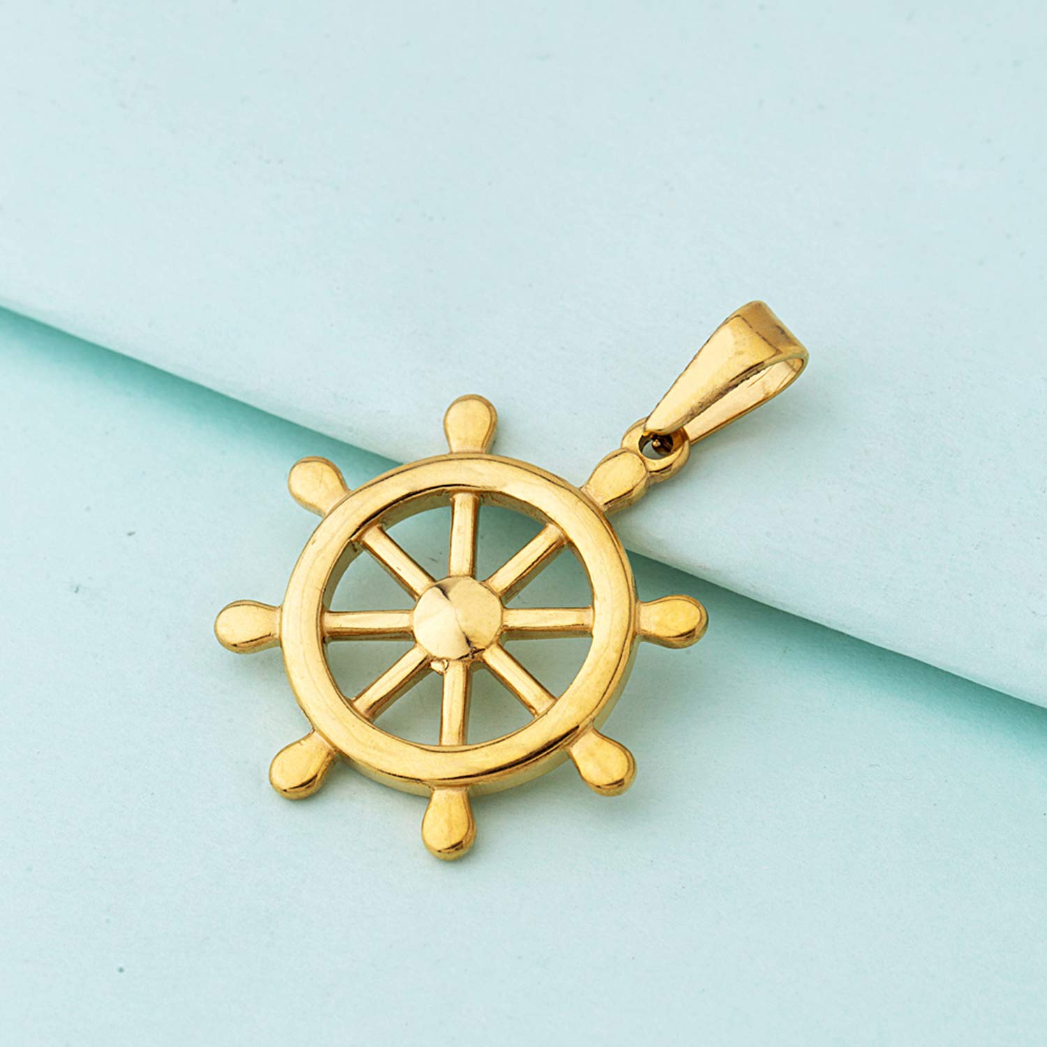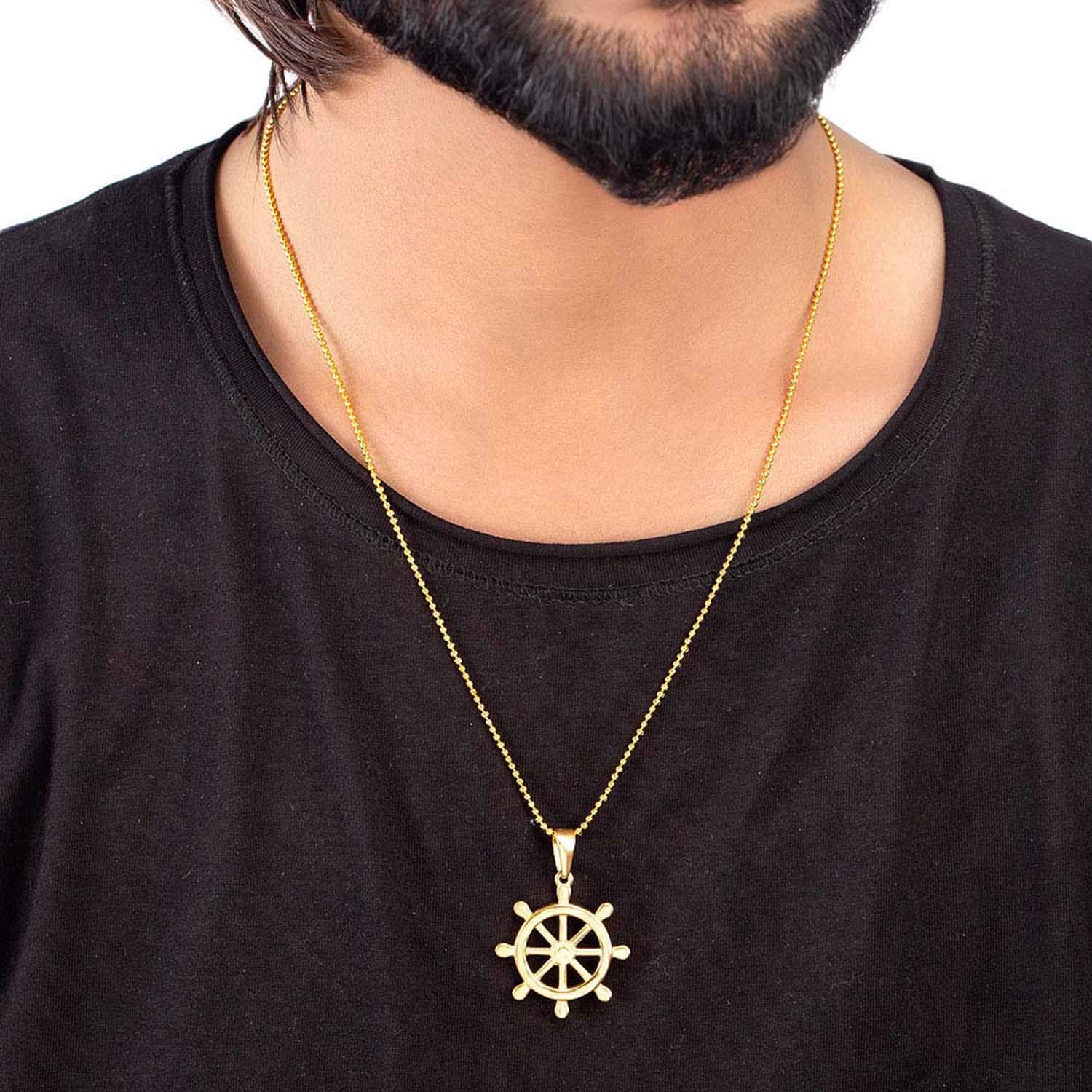 Yellow gold plated wheel pendant made from stainless steel. Wear with a formal shirt. To make your accessories last longer avoid harsh chemicals and moisture. Keep dry, clean with dry cloth and wear with panache. "Indiaâ€s largest fashion jewelry brand DARE, comes from the House of Voylla as a limited edition of handcrafted accessories for the modern Indian men. |