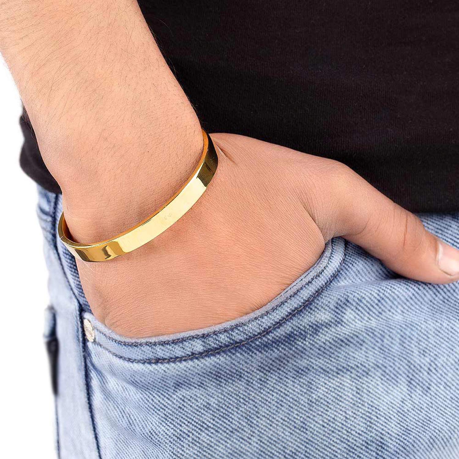 Classic men's bracelet with yellow gold plating, fashioned out of stainless steel. Pair with ethnic looks. To make your accessories last longer avoid harsh chemicals and moisture. Keep dry, clean with dry cloth and wear with panache. "Indiaâ€s largest fashion jewelry brand DARE, comes from the House of Voylla as a limited edition of handcrafted accessories for the modern Indian men. |