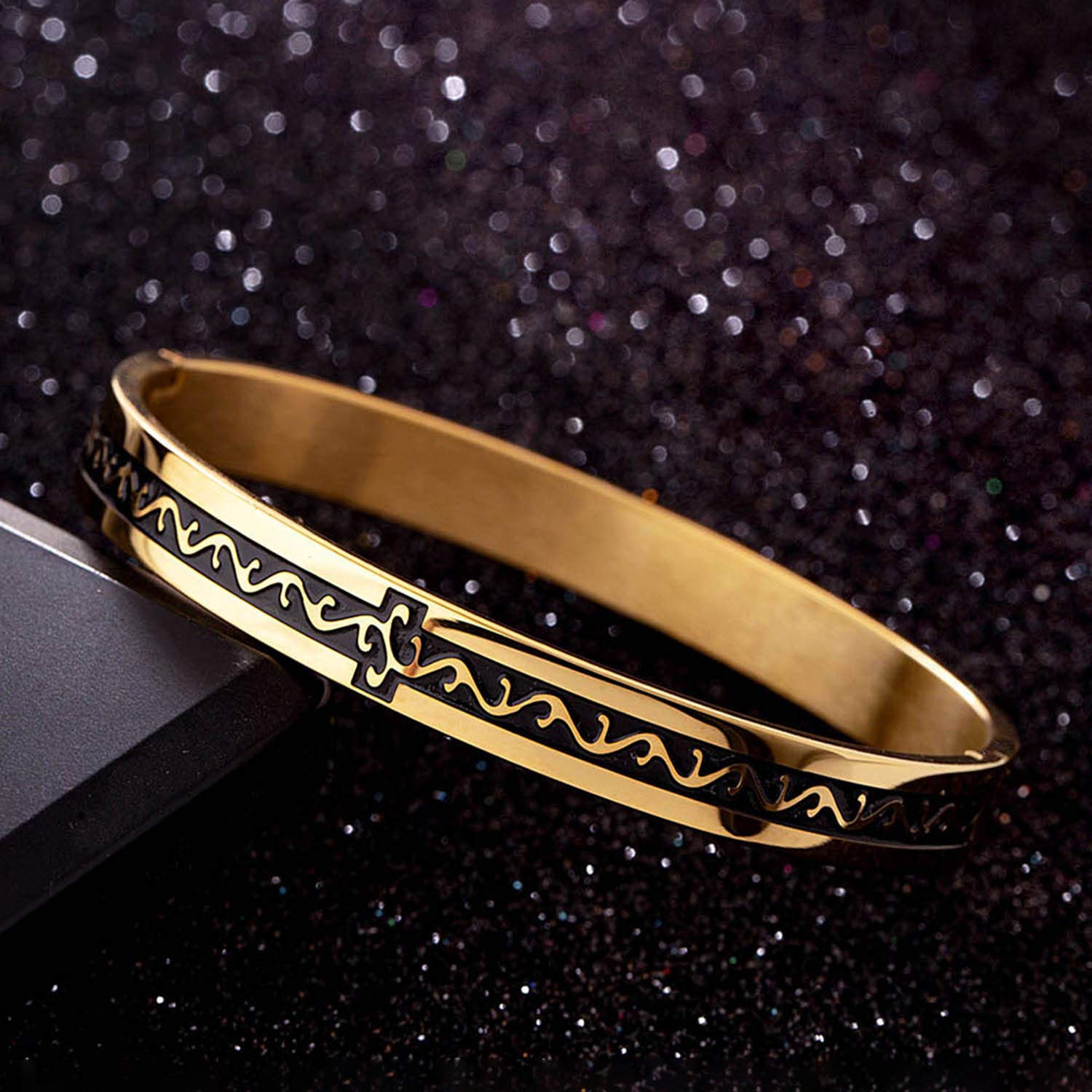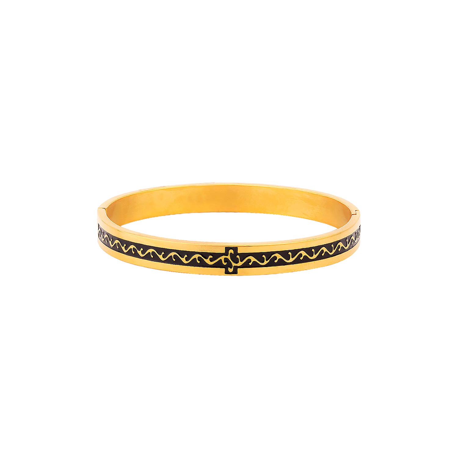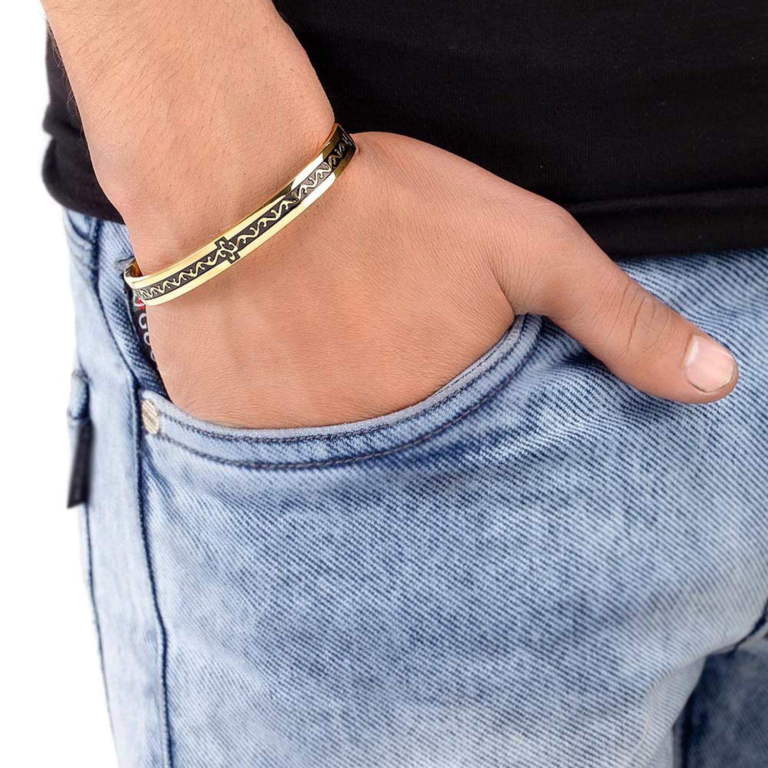 Yellow gold plated men's bracelet with patterns embossed on surface. Made from stainless steel. Wear with ethnic formal looks. To make your accessories last longer avoid harsh chemicals and moisture. Keep dry, clean with dry cloth and wear with panache. "Indiaâ€s largest fashion jewelry brand DARE, comes from the House of Voylla as a limited edition of handcrafted accessories for the modern Indian men. |
