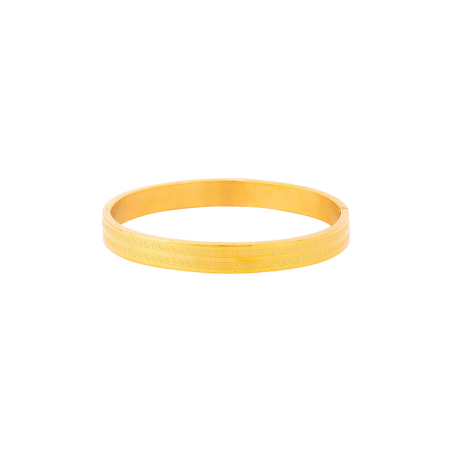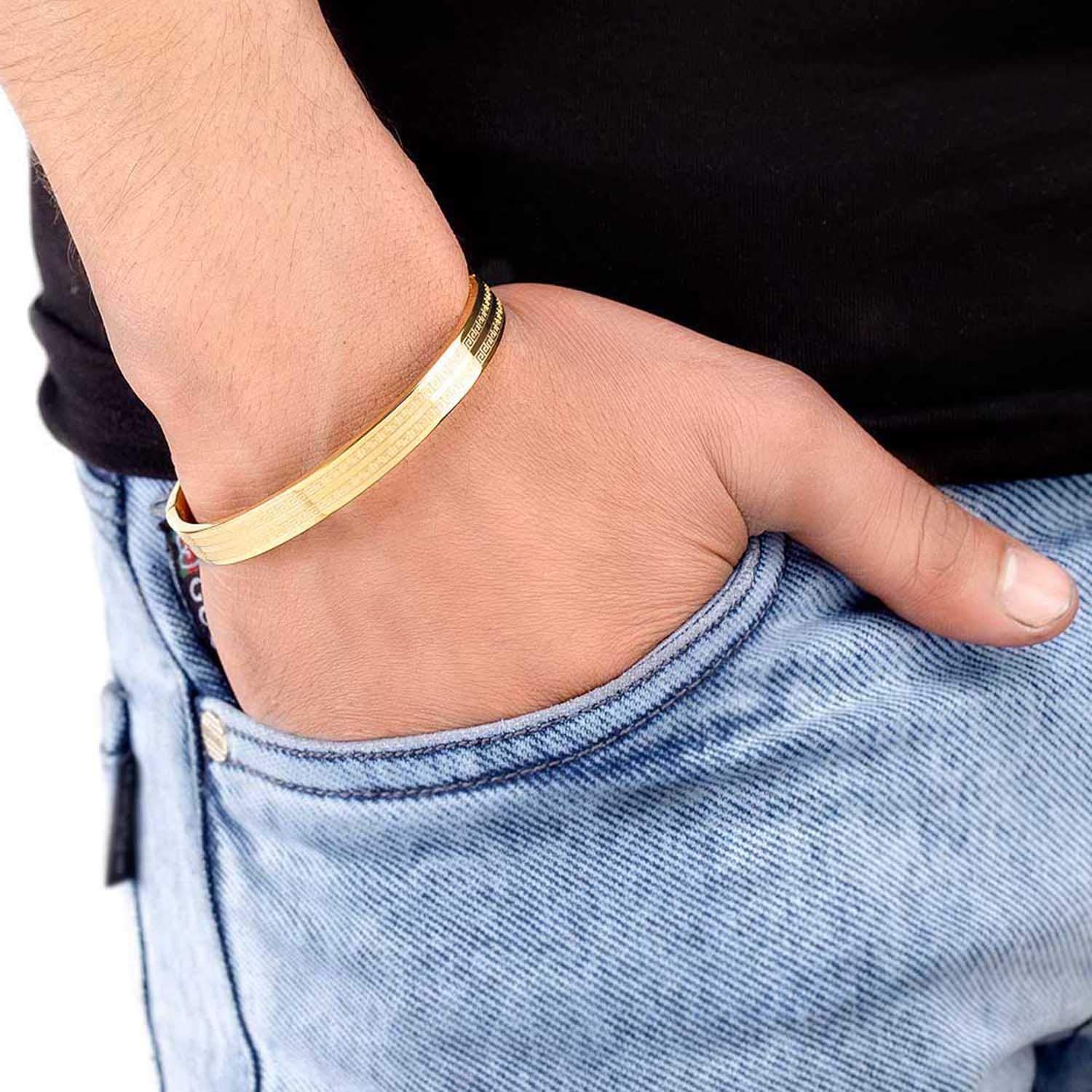 Textured surface bracelet for men with yellow gold plating. Made from stainless steel, lightweight and good for formal wear. To make your accessories last longer avoid harsh chemicals and moisture. Keep dry, clean with dry cloth and wear with panache. "Indiaâ€s largest fashion jewelry brand DARE, comes from the House of Voylla as a limited edition of handcrafted accessories for the modern Indian men. |