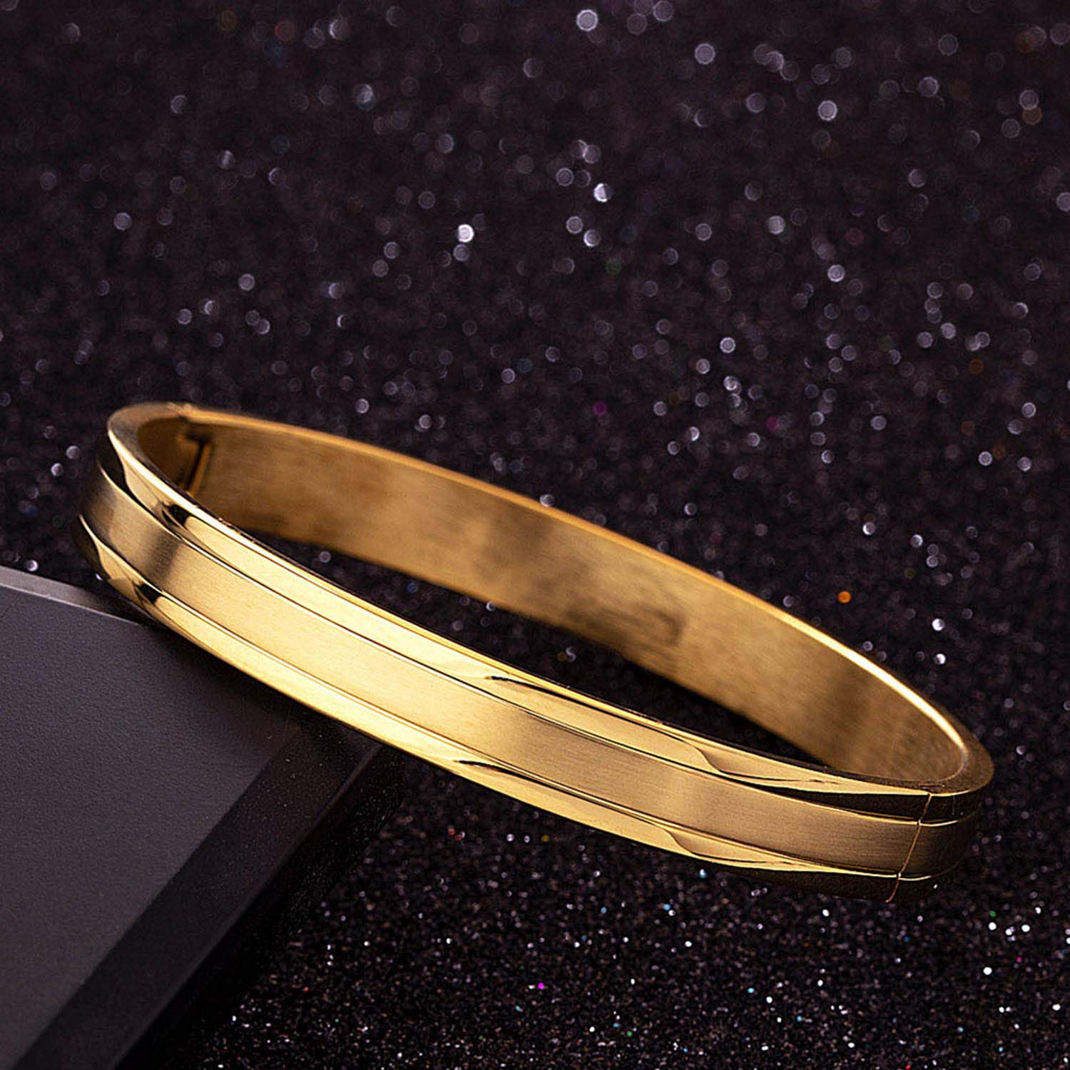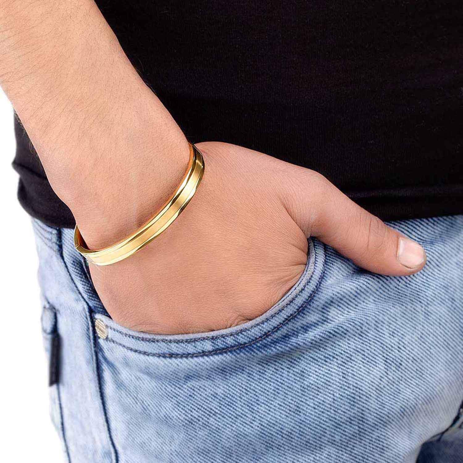 Yellow gold plated smooth bracelet for men. Crafted from stainless steel and good for formal wear. To make your accessories last longer avoid harsh chemicals and moisture. Keep dry, clean with dry cloth and wear with panache. "Indiaâ€s largest fashion jewelry brand DARE, comes from the House of Voylla as a limited edition of handcrafted accessories for the modern Indian men. |