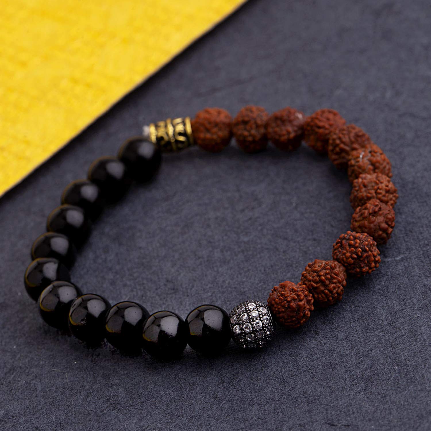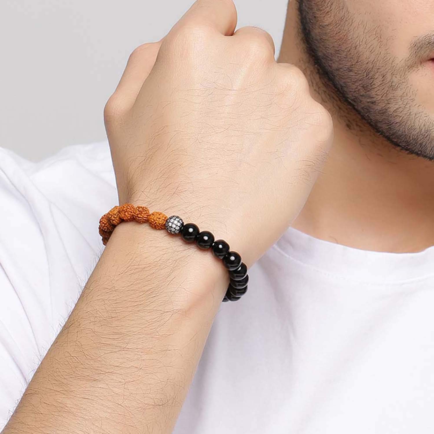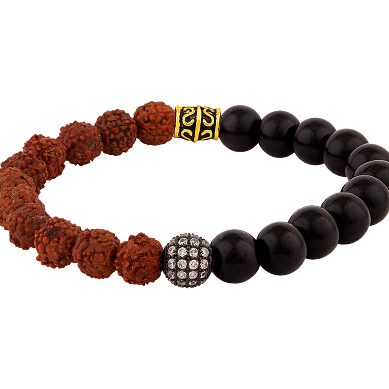 Rudraksha beads adorned two tone plated bracelet for men. Pair with ethnic looks. To make your accessories last longer avoid harsh chemicals and moisture. Keep dry, clean with dry cloth and wear with panache. "India�s largest fashion jewelry brand DARE, comes from the House of Voylla as a limited edition of handcrafted accessories for the modern Indian men. |