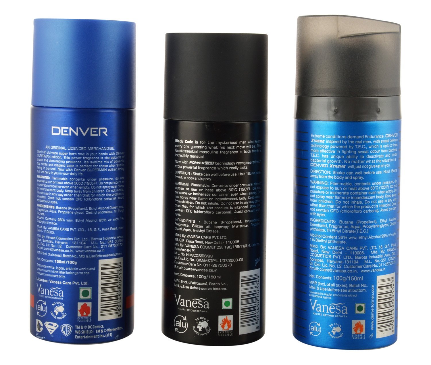 Package Contents: 1 Denver Black Code, 1 Denver Xtreme and 1 Denver Superman Deodorants