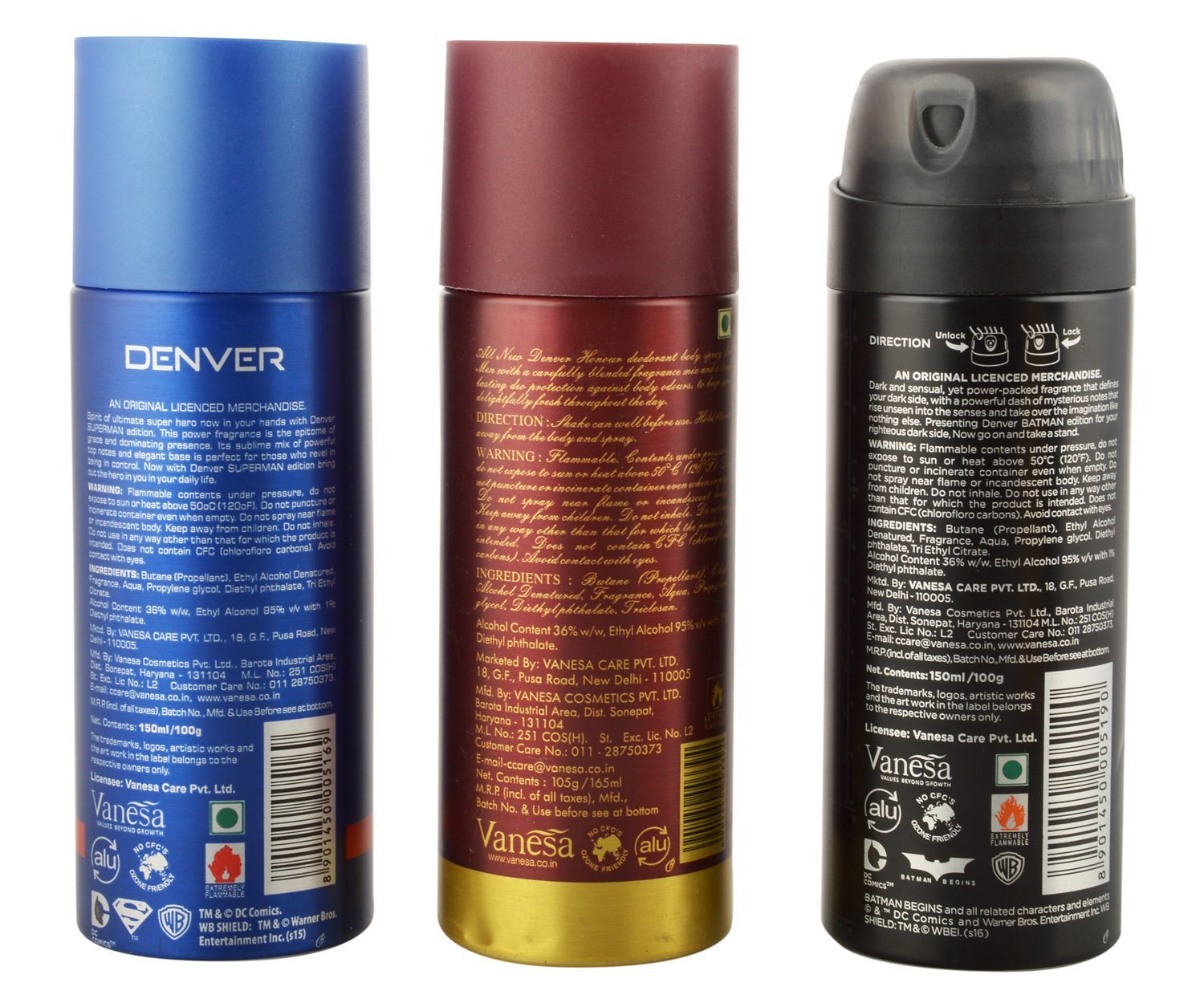 Quantity: Denver Batman and Superman (150 ml each) and Denver Honour (165 ml)
