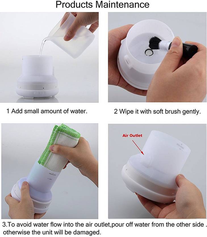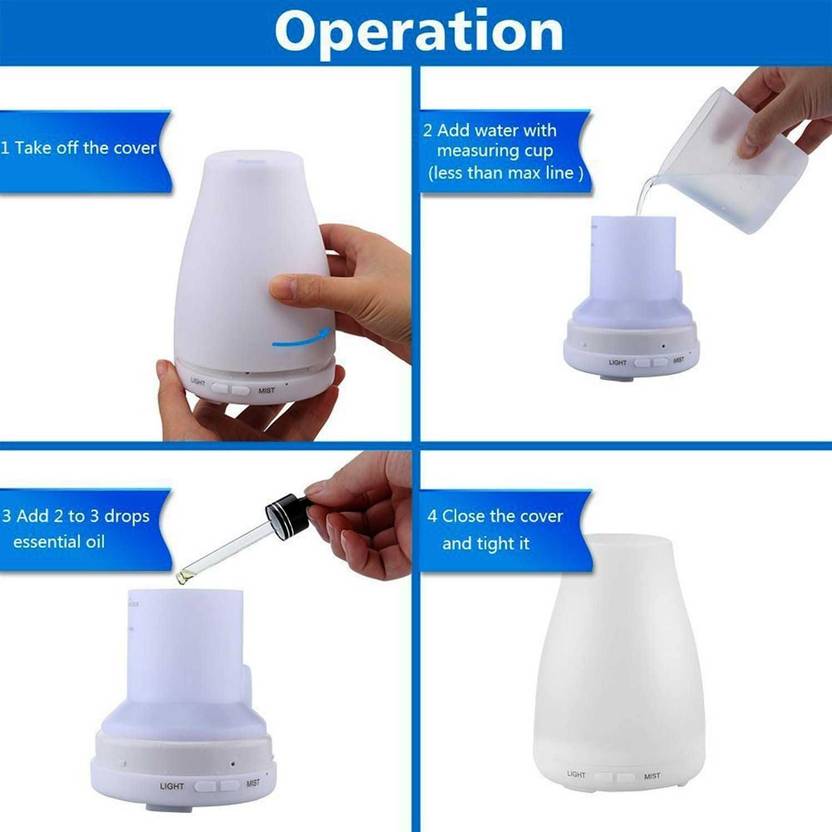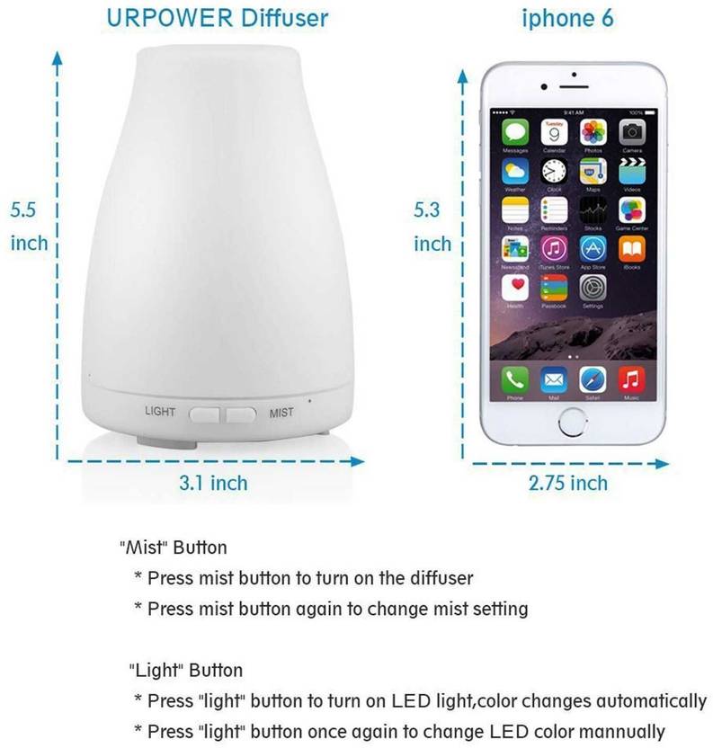 Oil is not included in the package. To prolong the lifetime of the item, please keep it try and clean when storing. If the water added over max line, the mist will be very thin(less water, more mist). If the ultrasonic wave chip was polluted, it may cause error action or default. Please don't touch the internal ultrasonic wave vibration board inside of the water tank directly with your hands. Description: Looking for a simple way to calm and freshen a room? This Ultrasonic Aroma Essential Oil Diffuser is elegant and easy to use. just add 100ML of water and a few drops of your favourite essential oil. Advanced ultrasonic vaporizing diffusion technology quietly releases a soothing fragrant mist up to 6 hours. Automatic shut off safety system when waterless protects the product from being burned out. Keep essential oil 100% natural without burning or heating and automatic shut off safely. This ultrasonic aroma humidifier does double duty to make your home fresher and healthier for up to 6 hours. First, the humidifier function adds moisture to the air to help you sleep better, cough less and alleviate dry sinuses. This handy unit also diffuses your favourite scented oils without heat, so their holistic properties stay intact. The result is healthful, moist air that smells subtly fresh and clean. Features: No filters required. Whisper-quiet operation. Auto shutoff for safety. Visually appealing, modern Japanese design. Helps with dry, chapped skin, chapped lips and dry sinuses. Works with ordinary tap water, plus 2 to 3 drops of essential oil Specifications: Size: 3.1"x5.5". Material: Upper parts PP. Input power: AC100-240V 50/60HZ. Advanced ultrasonic technology: 2.4MHZ. Length of the power supply cable: about 69.6 inch.