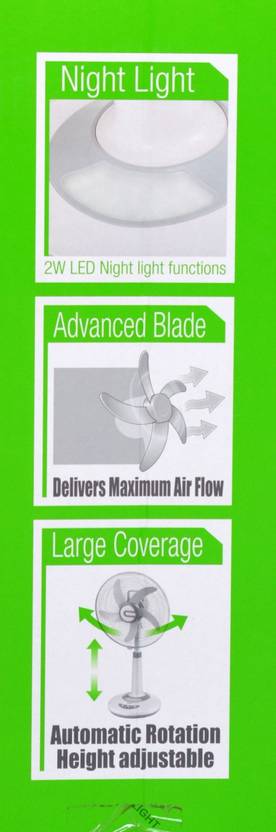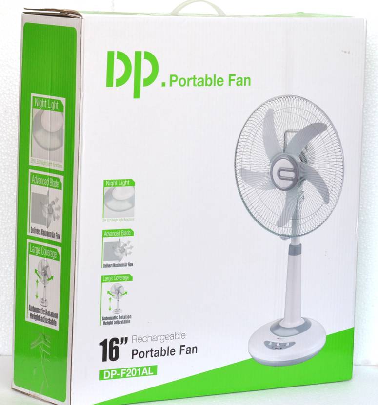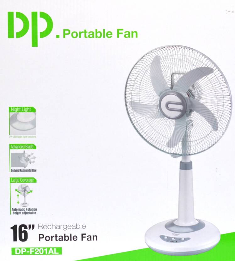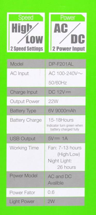 DP 16 INCH 5 ADVANCE BLADE DESIGN FOR MAXIMUM AIR MOVEMENT. Dual Battery ( 2X6 Volt 4500Mah ) - Replaceable and Rechargeable sealed Lead-Acid battery (INCLUDED) provide 6-10 hours working time. ADJUSTABLE HEIGHT WITH SWING MODE - For precisely directed airflow. [AC and DC Power Capability]: The Fan can be powered from AC Mains Power as well. 2W Led Light - 26 Hour Backup. 5V 1A USB Port for charging