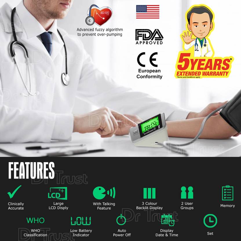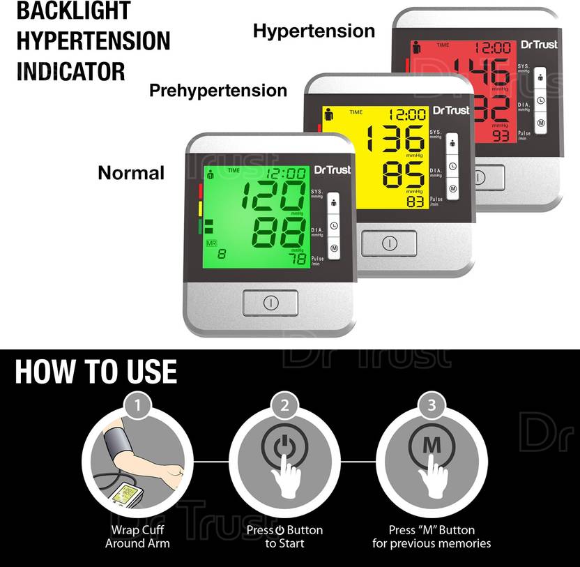 - Product Of USA With 5 Year Extended Warranty In India. Highest Standard Of Quality, Designed And Engineered By Nureca Inc USA. Patented Technology and Design from USA. Comes with advanced 3 Color Hypertension Backlight with Super Jumbo Screen for easy reading. It also has a power adapter included to save money in future (no batteries required). We also give a Dr Trust digital thermometer free. Customer to send BP monitor to Dr Trust Centre India for repair. Limited Warranty includes manufacturing defect only. Activate warranty on manufacturer website within 15 days of purchase. Breakage of bp monitor, water damage, general wear and tear, Cuff, adapter and batteries excluded from warranty. Warranty covers manufacturing defect in bp monitor. Customer to send bp monitor to Dr Trust service centre for repair. Please do not attempt to repair bp monitor yourself /unauthorized repair as this may cause electric shock and will also void warranty.
