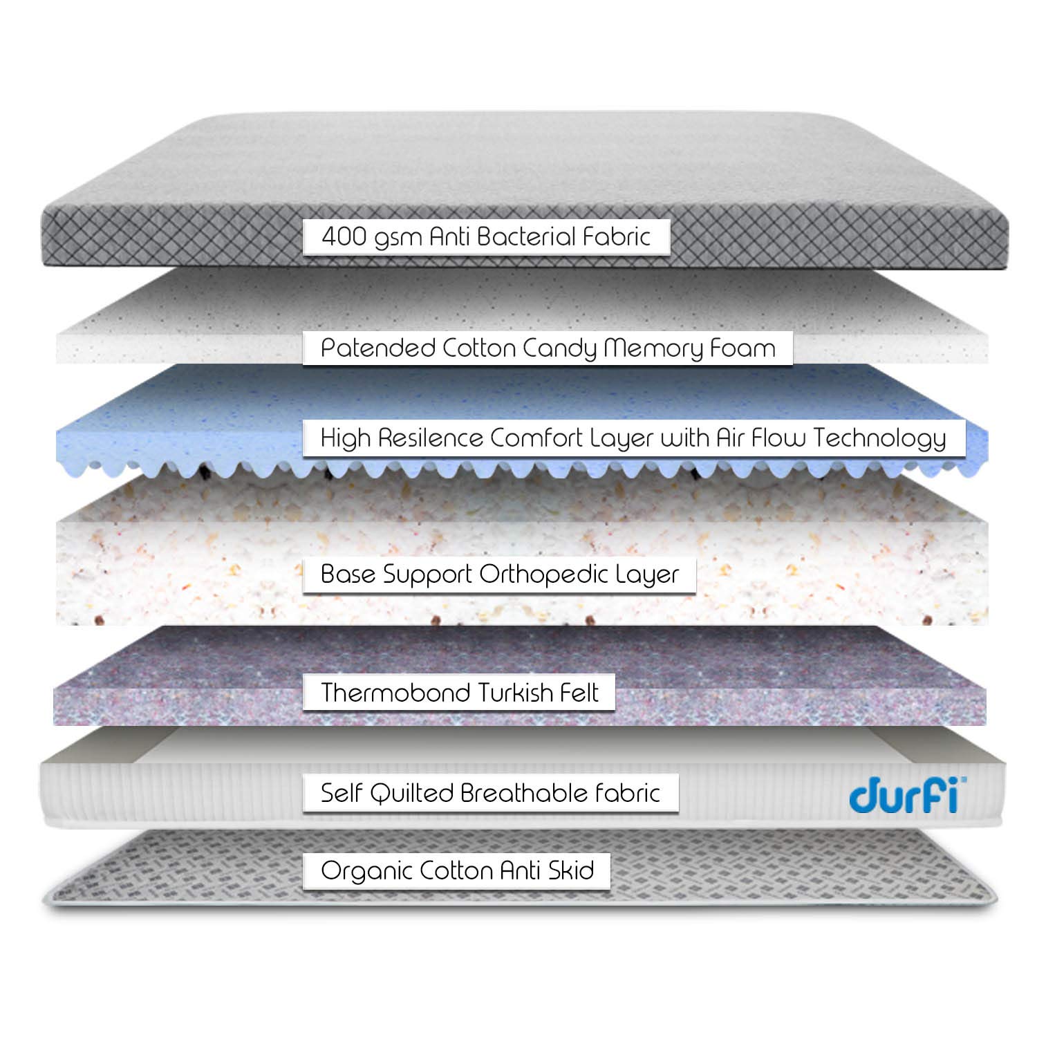 Support base layer is really strong and sturdy made form Re-Active foam, can provide firm support to mattress, mattress can long last without any sagging. Durfi mattress is free from harsh chemicals.