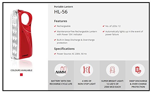 Maintenance free rechargeable lantern with power on indicator, operating time 4 hours on full charge with 12 powerful LED